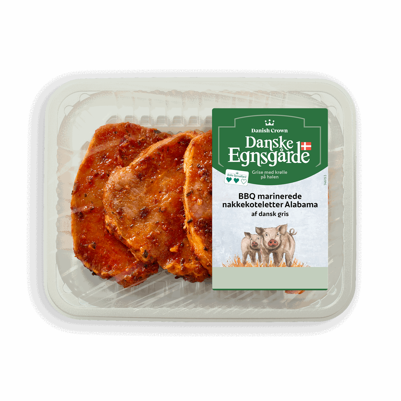 450 gNakkekoteletter fra Danske Egnsgårde er 100% dansk, fra grise født og opdrættet hos udvalgte landmænd, der driver landbrug med hjertet på rette sted i forhold til bedre dyrevelfærd for deres grise. Med en krydderiblanding inspireret af det sydlige USA og Alabamas berømte BBQ-traditioner, får du en saftig og velsmagende oplevelse med grøn peber, paprika, koriander og andre aromatiske ingredienser. Vores nakkekoteletter er skabt til at imponere på en hyggelig grillaften. Steg dem på panden, eller tilbered dem over glødende kul.