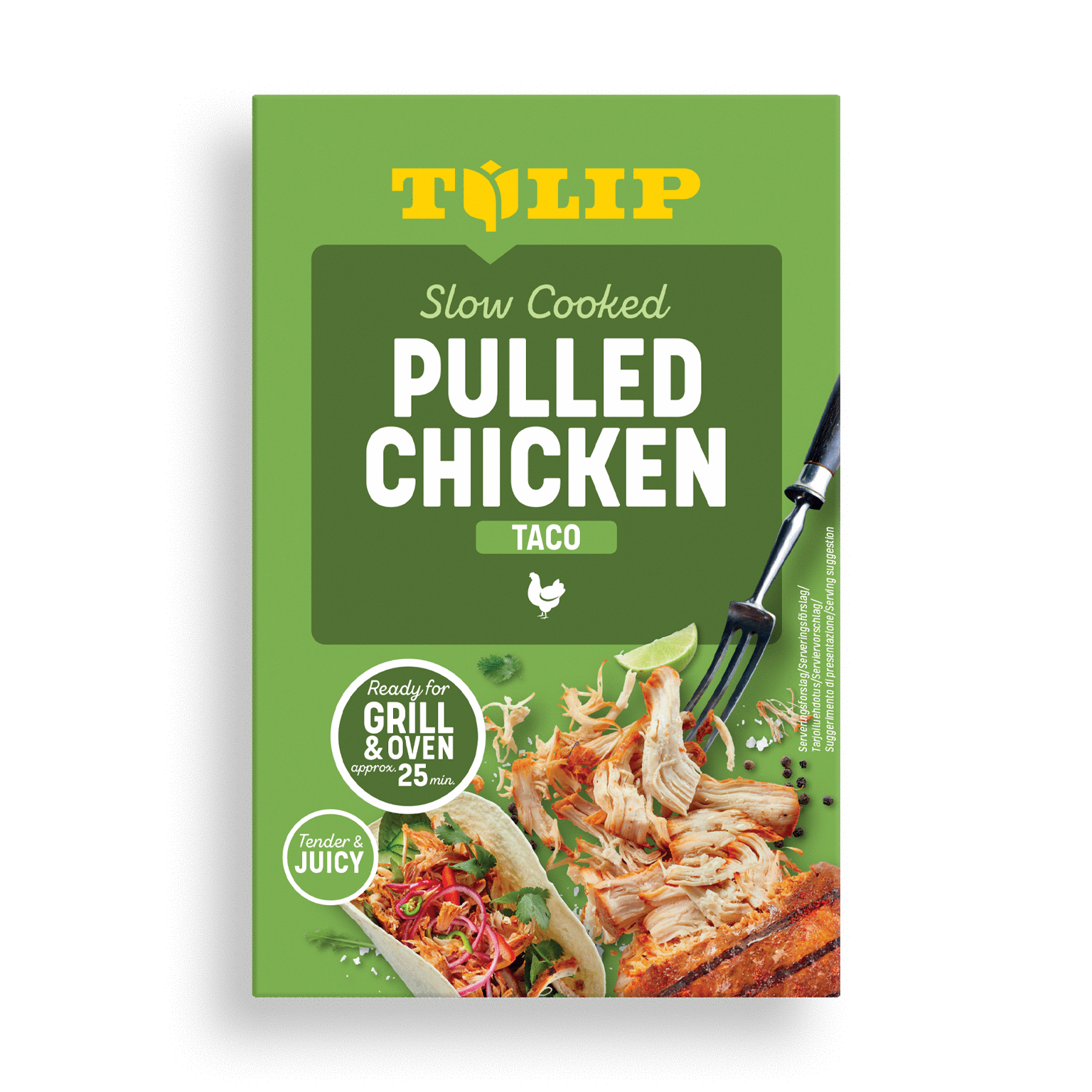 500 gTulip Pulled Chicken Taco er lavet af kyllingebryst, hvor saft, smag og kvalitet går hånd i hånd. Med inspiration fra det mexicanske street food-køkken er kødet krydret med en lækker tacosmag. Krydderiet er allerede i kødet og giver det en perfekt krydret smag. Serveres som taco burrito sammen med nachos og guacamole.