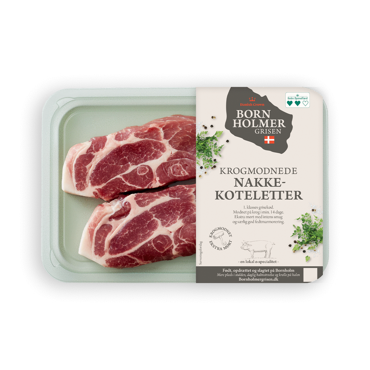 BORNHOLMERGRISEN Krogmodnede nakkekoteletter er skåret af udvalgt 1. klasses grisekød med en særlig god fedtmarmorering. Kødet modnes på krog i minimum 14 dage. Modningen gør kødet ekstra mørt og den langsomme udtørring giver en nuanceret og intens smag for en bedre spiseoplevelse.