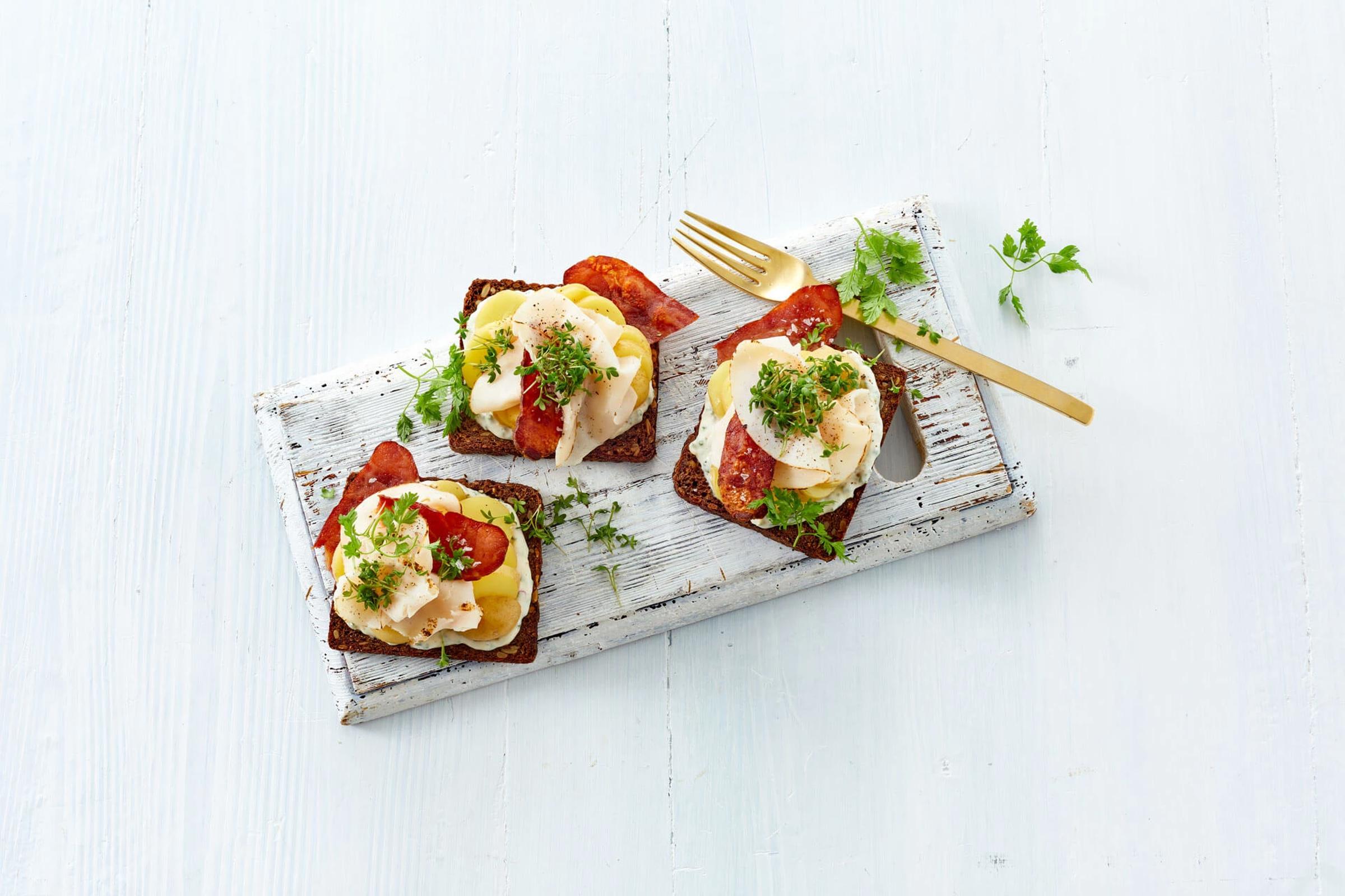 Kartofler er også rigtig gode sammen med fx æg. Skær kartofler, løg, hvidløg og rød peberfrugt i tynde skiver, og svits det hele på panden i lidt olie. Hæld en samlet masse af æg, mælk, parmesanost, oregano, salt og peber over grøntsagerne. Steg frittataen under låg i 20-25 minutter, indtil den er fast. Vend frittataen, og steg den på den anden side i 10 minutter. Servér frittataen med rugbrød som tilbehør.