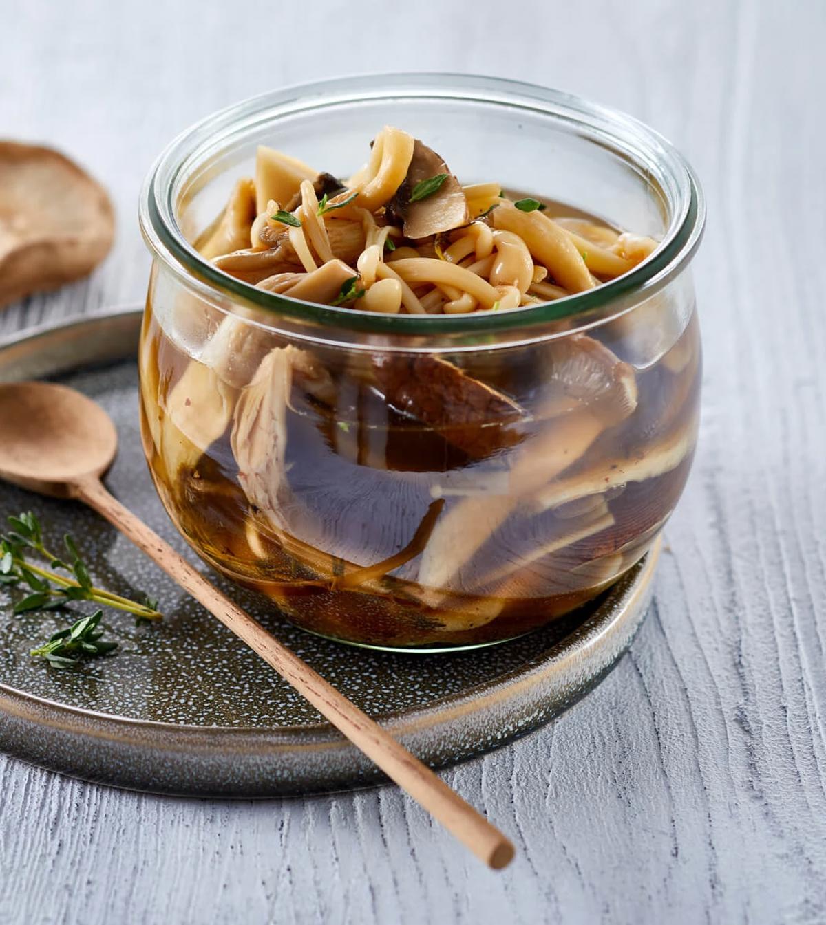 Svampe er også dejligt nemme at sylte. Rengør svampene, og kog en lage op på eddike, honning, timian, peberkorn og citronsaft. Kom svampene i lagen, når honningen er opløst, og lad det hele simre i 2-4 minutter. Hæld lagen og svampe i et sylteglas, og lad det hele trække til dagen efter. Brug de syltede svampe i en svampesuppe eller som fyld i en sandwich.