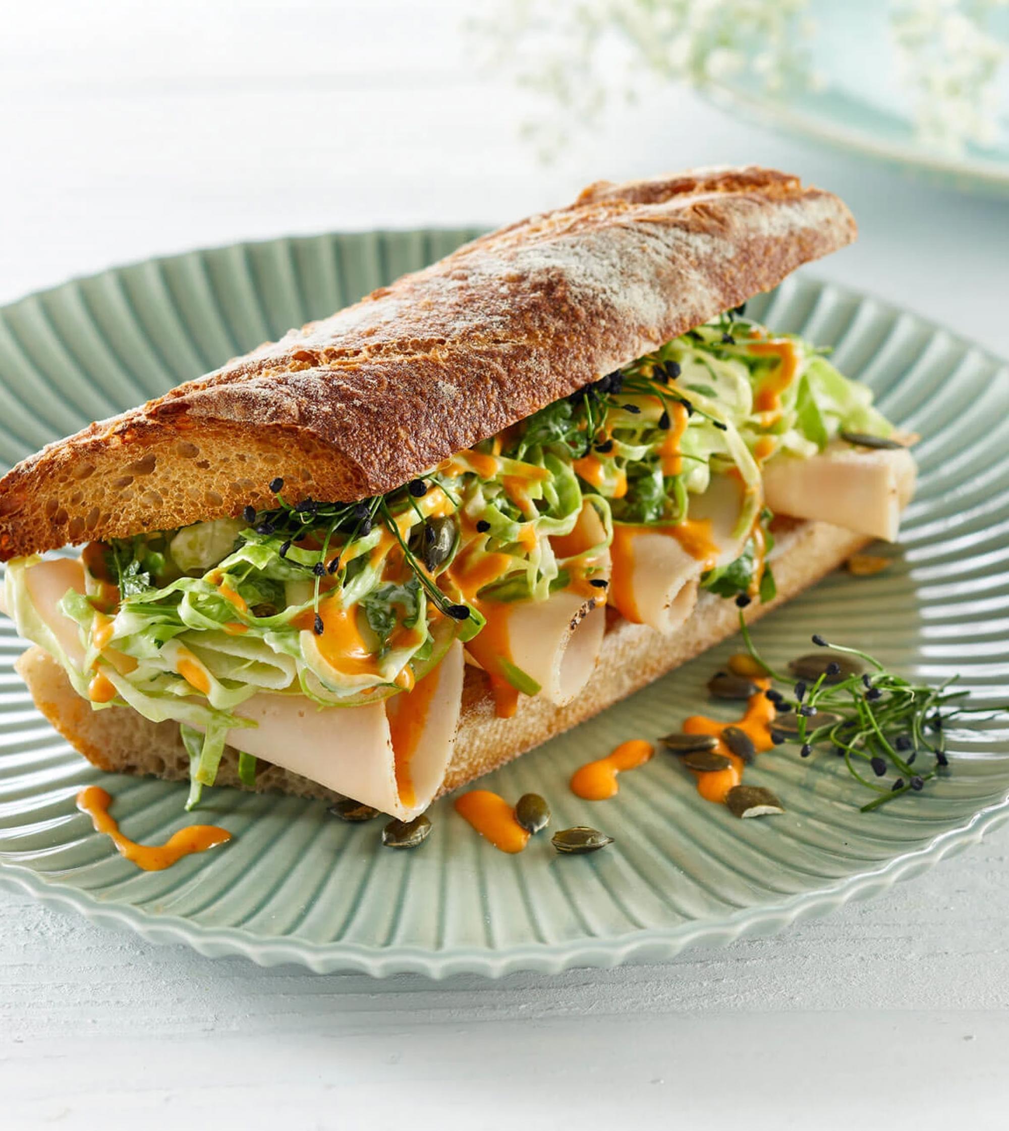 Fuldkornswrap med hamburgerryg, kalkunbacon og spinat