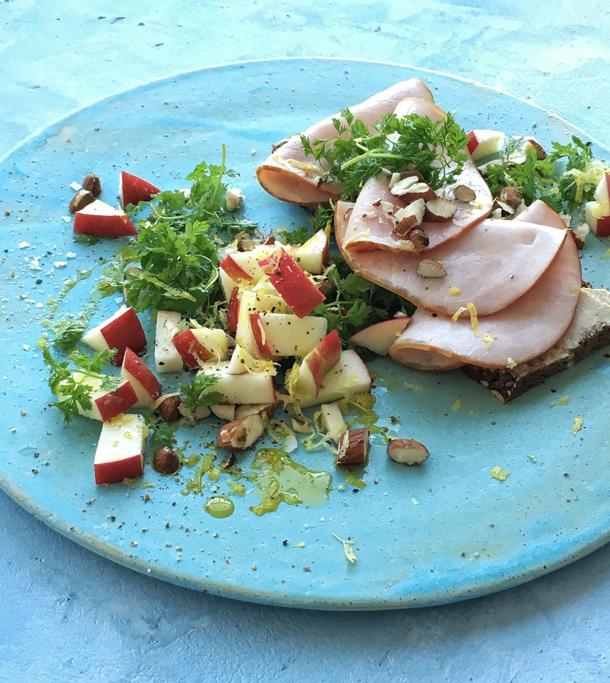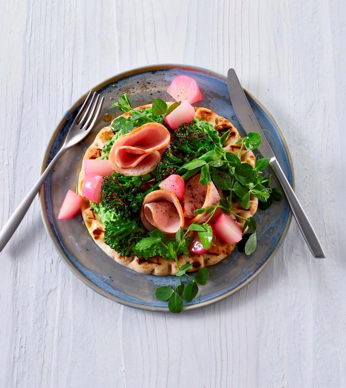 Nyd en frisk og anderledes frokost med vores opskrift på sandwich i hytteostbrød. Dette hjemmelavede brød, lavet med hytteost, æg og friske urter, er en frisk og lækker base for en velsmagende sandwich. Fyldet består af cremet hummus, salatblade, hamburgerryg, agurkstrimler og soltørrede tomater.