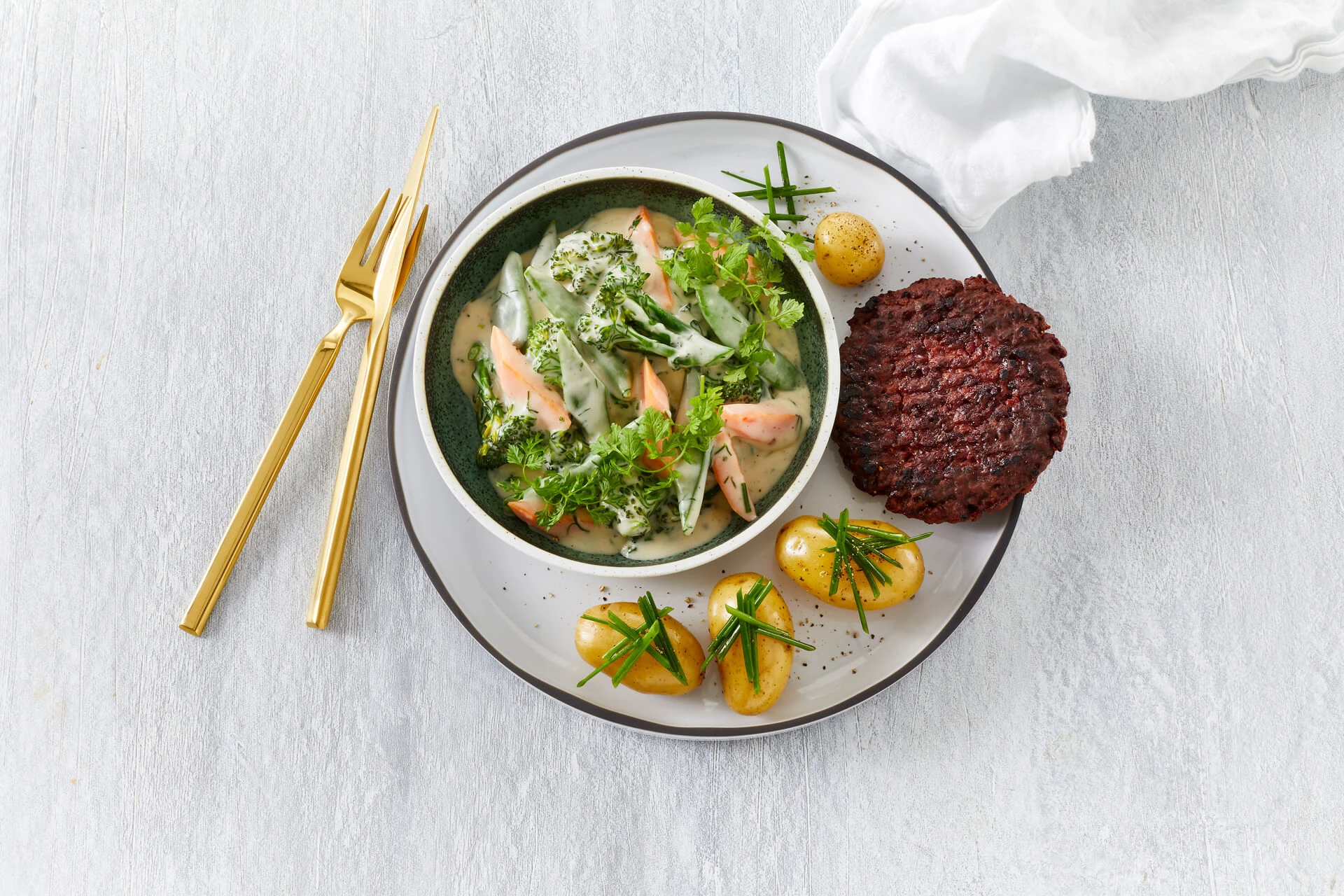- Nykogte kartofler og en skøn, cremet stuvning er en rigtig dejlig garniture til bøfferne, men går også rigtig godt til flere af vores andre vegetariske hovedretter. Her kan du i øvrigt overveje at gå helt Old School og udskifte gulerødder, snittebønner og sugar snap ærter med en tilsvarende portion helt fintskåret hvidkål eller spidskål. Kom i den varme stuvning, og lad trække som beskrevet, og varm hurtigt igennem igen lige inden maden skal på bordet. Ren Mormor-idyl!