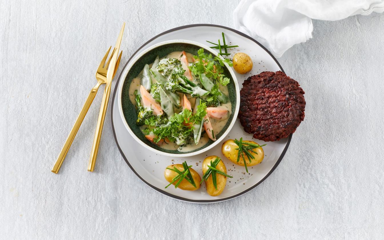 Letstuvede grøntsager med veggie bøf