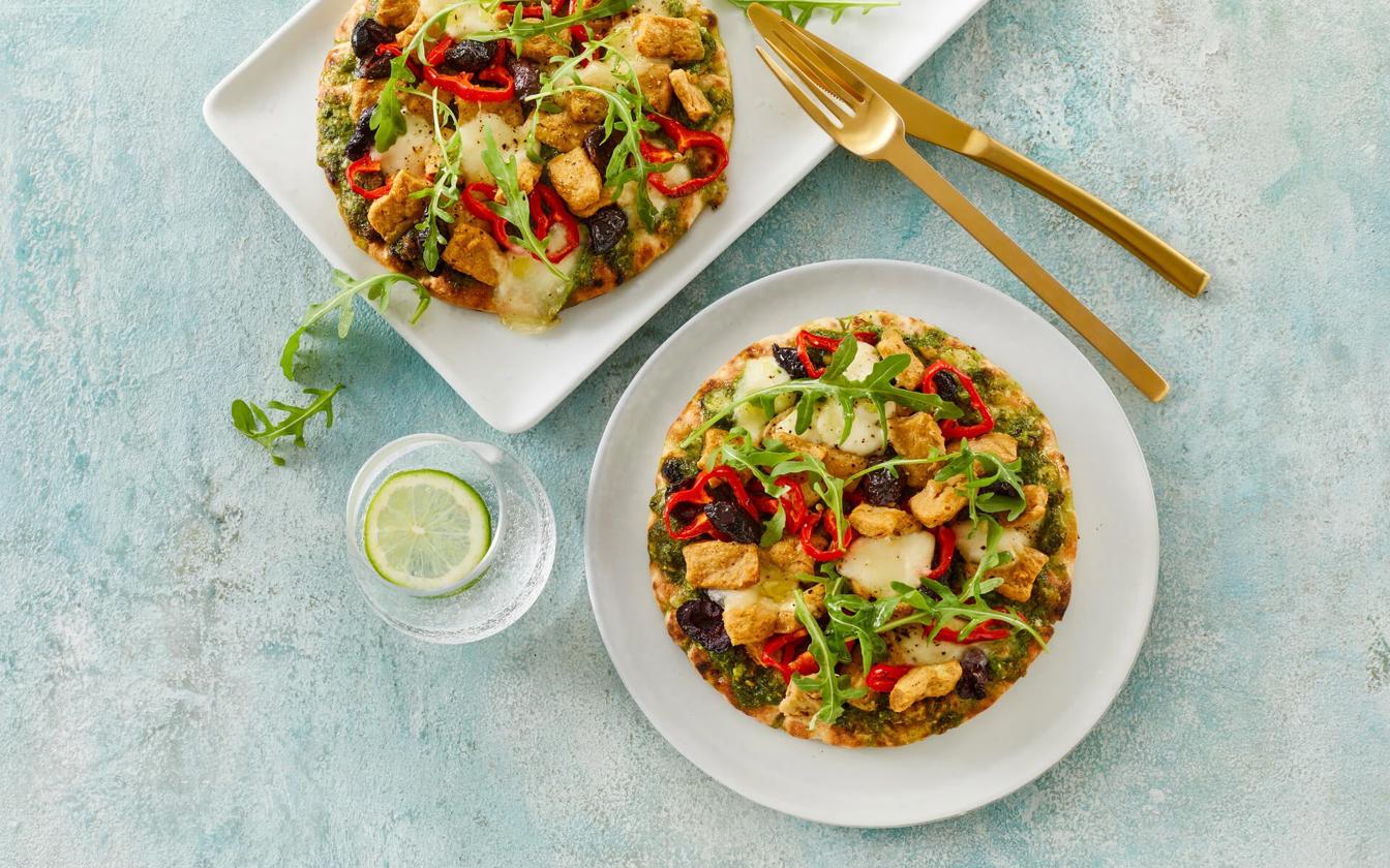 Vi bygger pizzaen op på et par gode fuldkorns-fladbrød, og så er det ellers på med alt det grønne: persillepesto, snackpeber, grønkål og rucola, og så nogle gode veggie bites. Så sæt bare tænderne i denne pizza for et skønt, grønt alternativ.