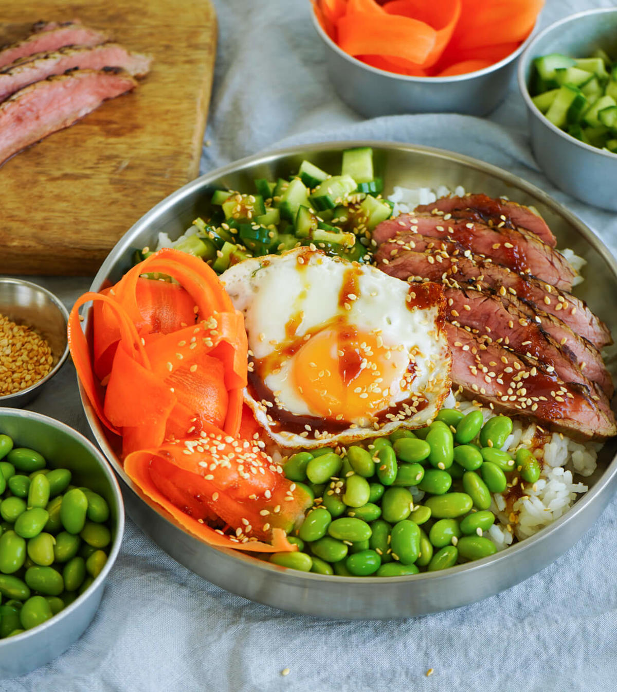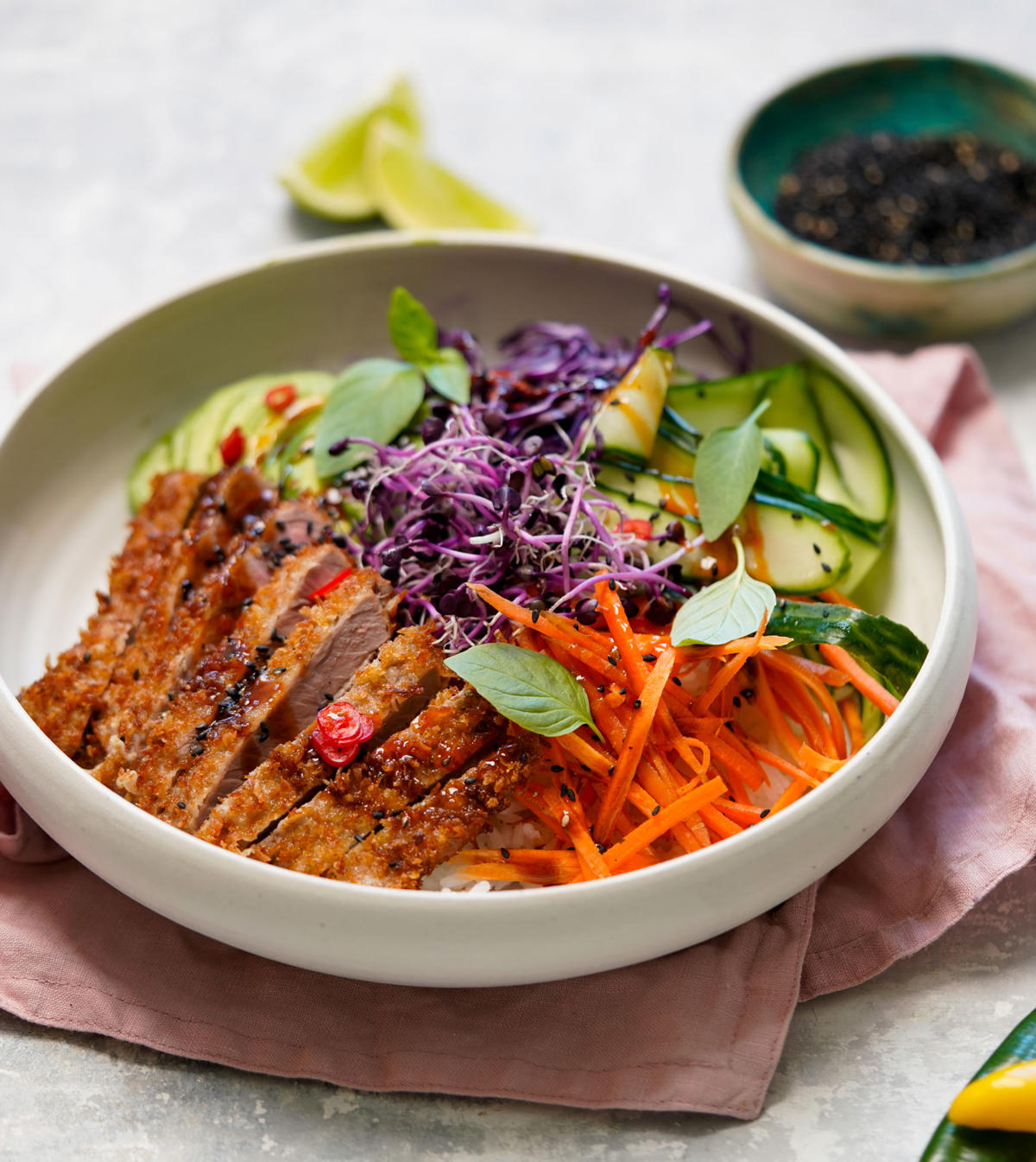 - Hvis du har lyst til at give din bowl ekstra smag, så kan du vende ris eller quinoa med lidt dressing, inden du lægger det i skålen. Marinér din quinoa i citron og olivenolie med lidt salt – eller rør en lækker asiatisk-inspireret marinade af soja, sesamolie og et nip sukker til dine ris.