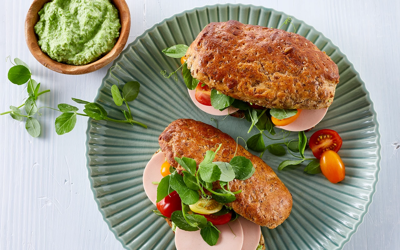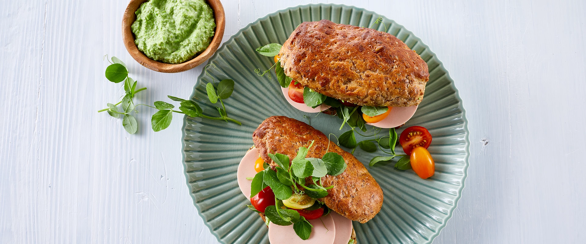 Rugbrødsbolle med ærtehummus og Veggie Sandwich Skiver