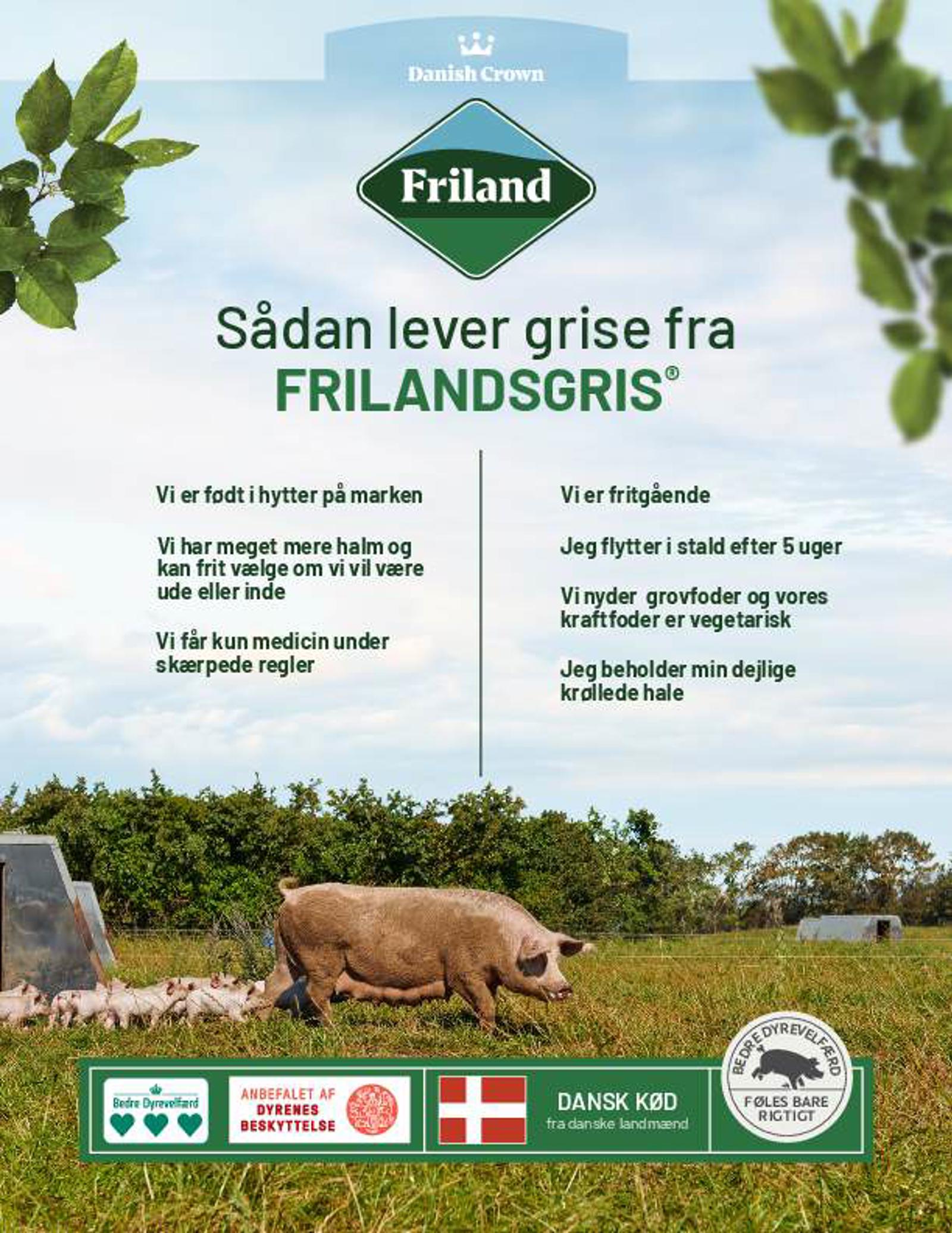 FRILANDSGRIS® kommer til verden i en hytte på marken. Alle søer er fritgående – og grisene har rig mulighed for at boltre sig på marken. Smågrisene fravænnes soen efter 5 uger, herefter de flyttes til stalde med meget mere halm. FRILANDSGRIS® har altid adgang til udendørsarealer i form af løbegårde. FRILANDSGRIS® er sikret et liv med krølle på halen, frisk luft og lidt ekstra plads til omsorg. FRILANDSGRIS® er dansk grisekød – født, opdrættet og slagtet i Danmark. FRILANDSGRIS® er anbefalet af Dyrenes Beskyttelse og har tre hjerter inden for det statslige dyrevelfærdsmærke – Bedre Dyrevelfærd. Det er netop din garanti for, at FRILANDSGRIS® har haft en opvækst, som tilgodeser dyrenes naturlige adfærd.