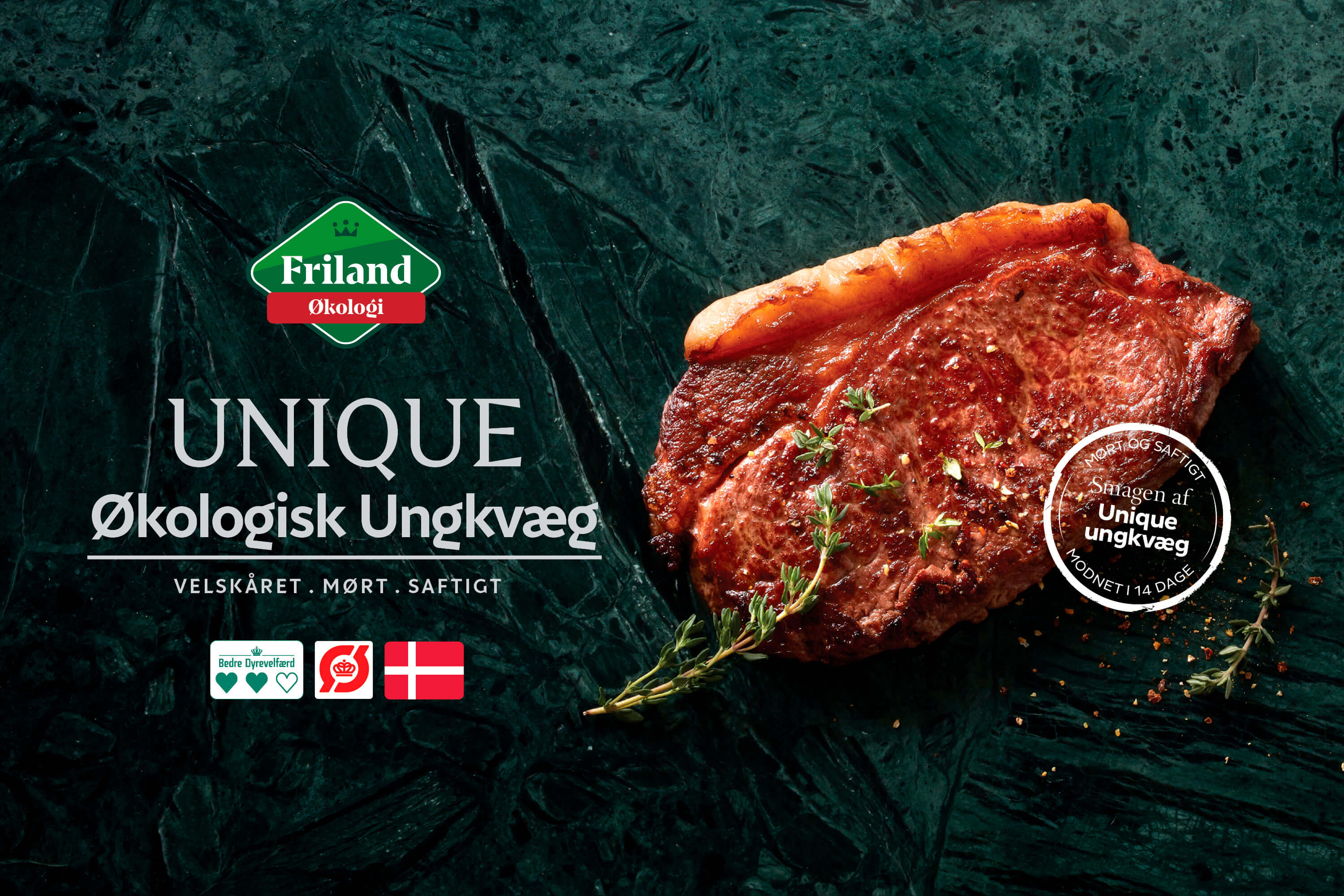 De økologiske ungkvæg lever hele sommeren på græsmarker, og når det bliver vinter rykker de ind i stalden. Her er der god plads til bevægelse og masser af strøelse. Ungkvægene bliver kun fodret med 100% økologisk – og GMO frit foder. Markerne hvorfra fodret er produceret, er hverken behandlet med sprøjtemidler eller kunstgødning. FRILAND ØKOLOGI Unique adskiller sig fra de økologiske kreaturer ved at de aldrig bliver malket. Hos ungkvægene er der fokus på at udvikle store gode muskler med intramuskulært fedt, hvorfor du vil opleve en helt unique kvalitet på kødet.
