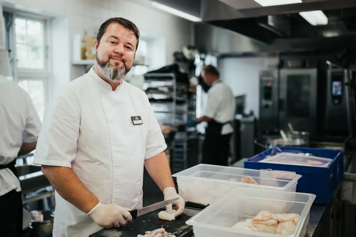 I køkkenet er det køkkenchef Martin Riber, der har ansvaret for menuen og personalet. Hotellet har opnået sølv i det økologiske spisemærke. Friland leverer både økologiske okse- og kalvekød til Gl.Avernæs.