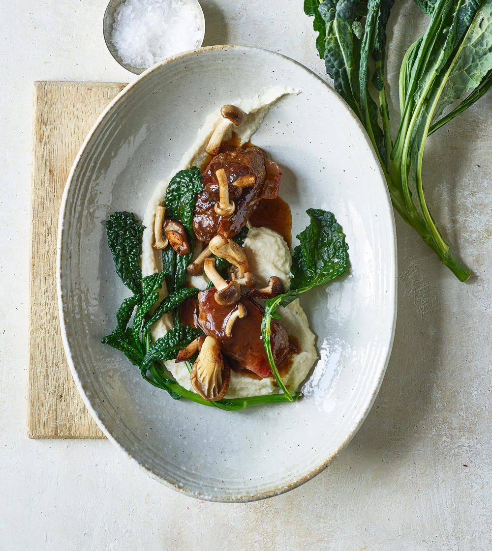 Glaserede nakkekoteletter med ovnbagte sprøde bønner og fetadrys