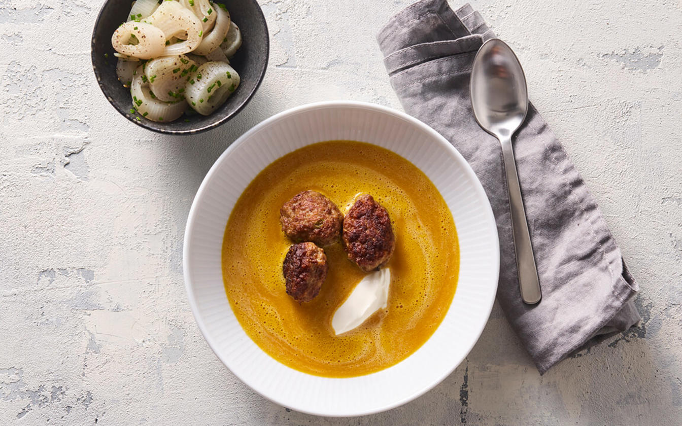Græskarsuppe med asiatisk inspirerede kødboller og skalotteløg