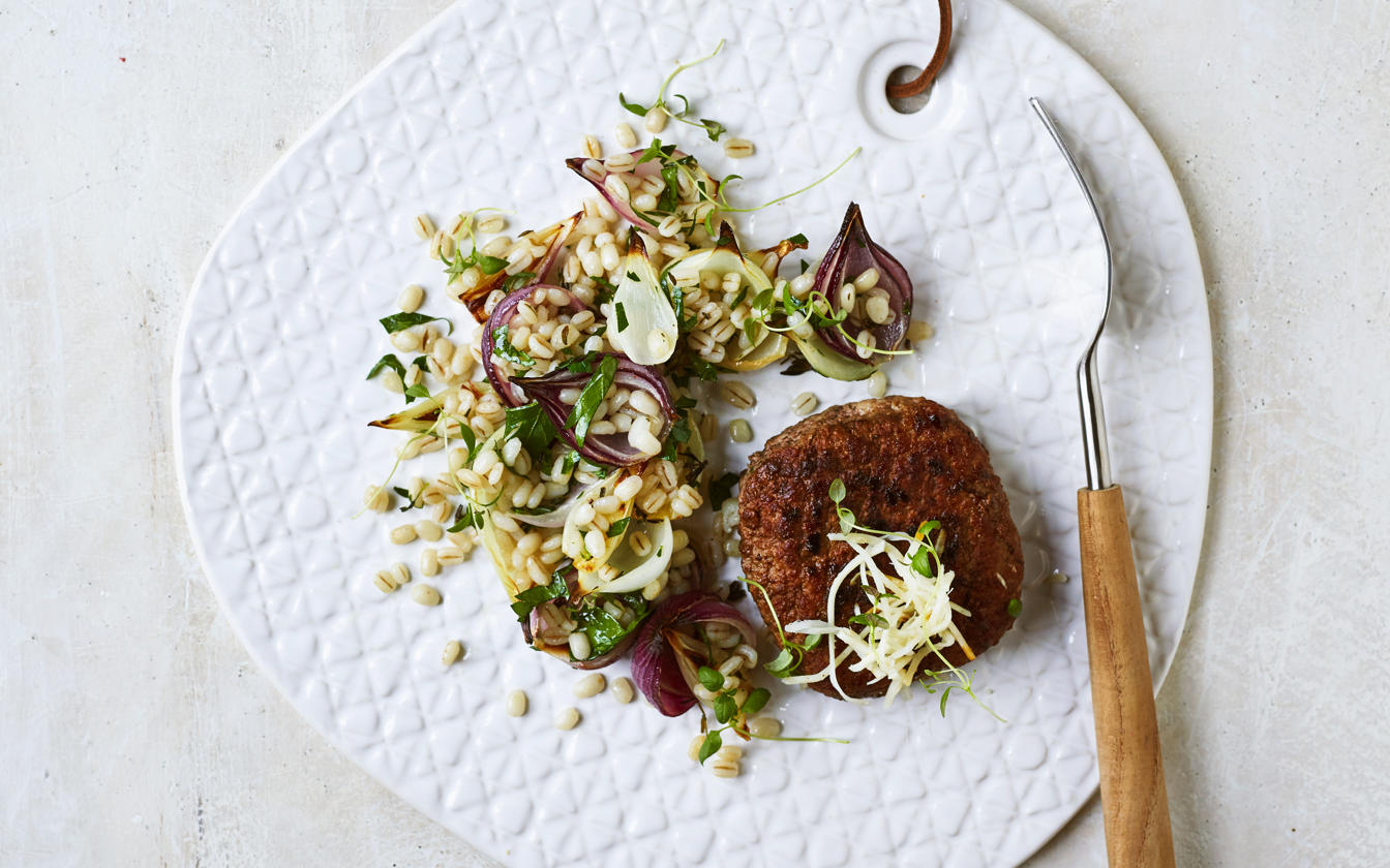 Prøv en nyfortolkning af en klassiker med hakkebøf og bagte løg i perlebyg. Frilands saftige oksekød møder den fyldige smag af bagte løg og lækre perlebyg. En velsmagende og rustik ret, der gør hverdagens aftensmad til noget særligt.