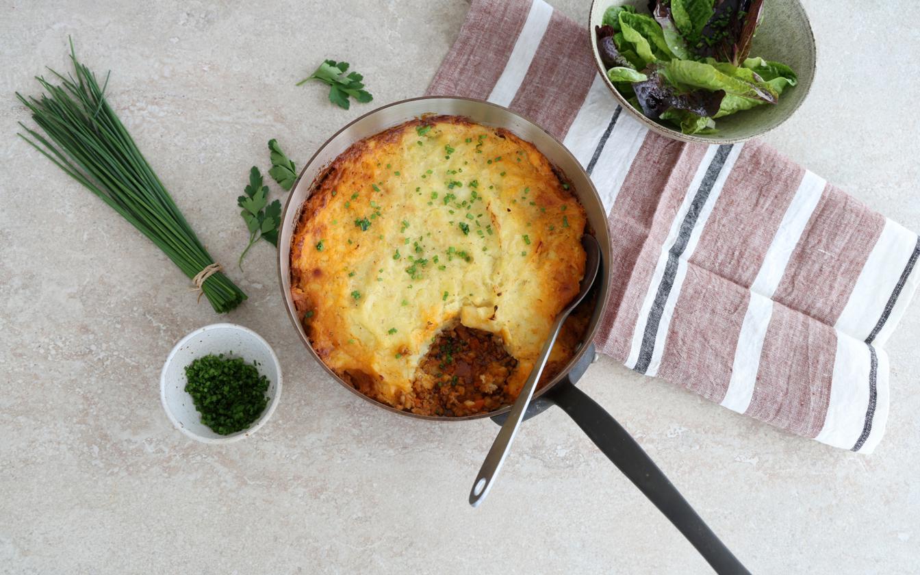 Shepherds pie er sådan en ret, der altid samler folk omkring bordet. Her laver vi den med grisekød, masser af grøntsager og en blød kartoffel‑pastinakmos på toppen. Det er en varm og tryg servering, der giver ro på en travl hverdag – og så passer den sig selv det meste af tiden. Lav den i et ovnfast fad og sæt den midt på bordet. Alle ved præcis, hvad de skal gøre derfra.