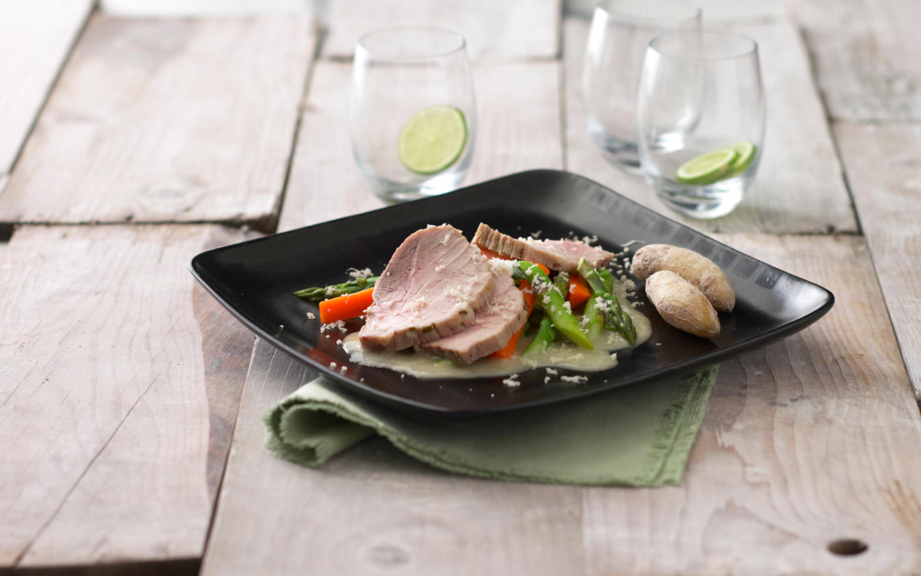 600 gdampede grønsager, fx grønne asparges, gulerødder og sukkerærter.