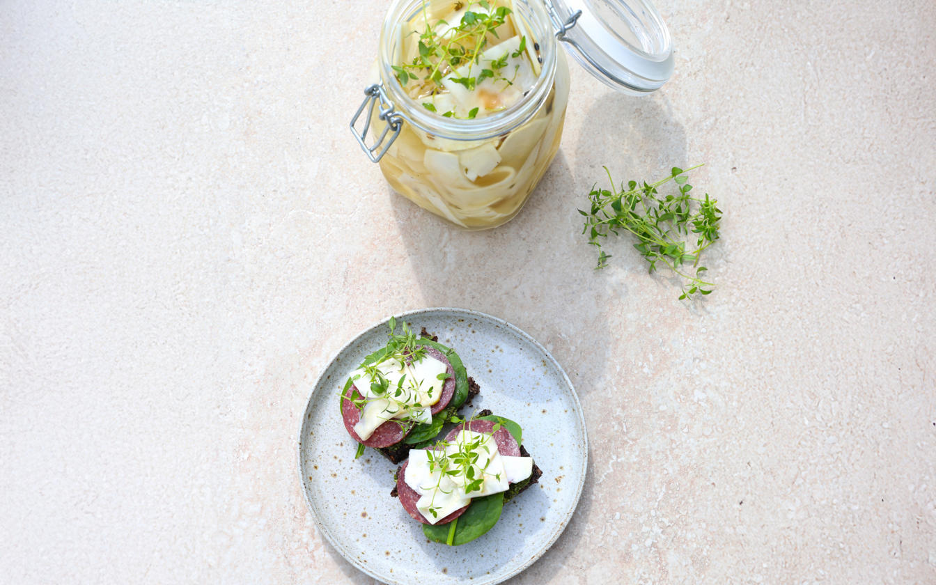 Syltet knoldselleri er et enkelt og smagfuldt tilbehør, der giver syre, sprødhed og dybde til både hverdagsretter og gæstemad. De tynde skiver af knoldselleri får et aromatisk løft fra timian og peberkorn – og det hele tager kun få minutter at forberede. Brug dem i salater, i sandwich eller som et frisk pift til varme retter.