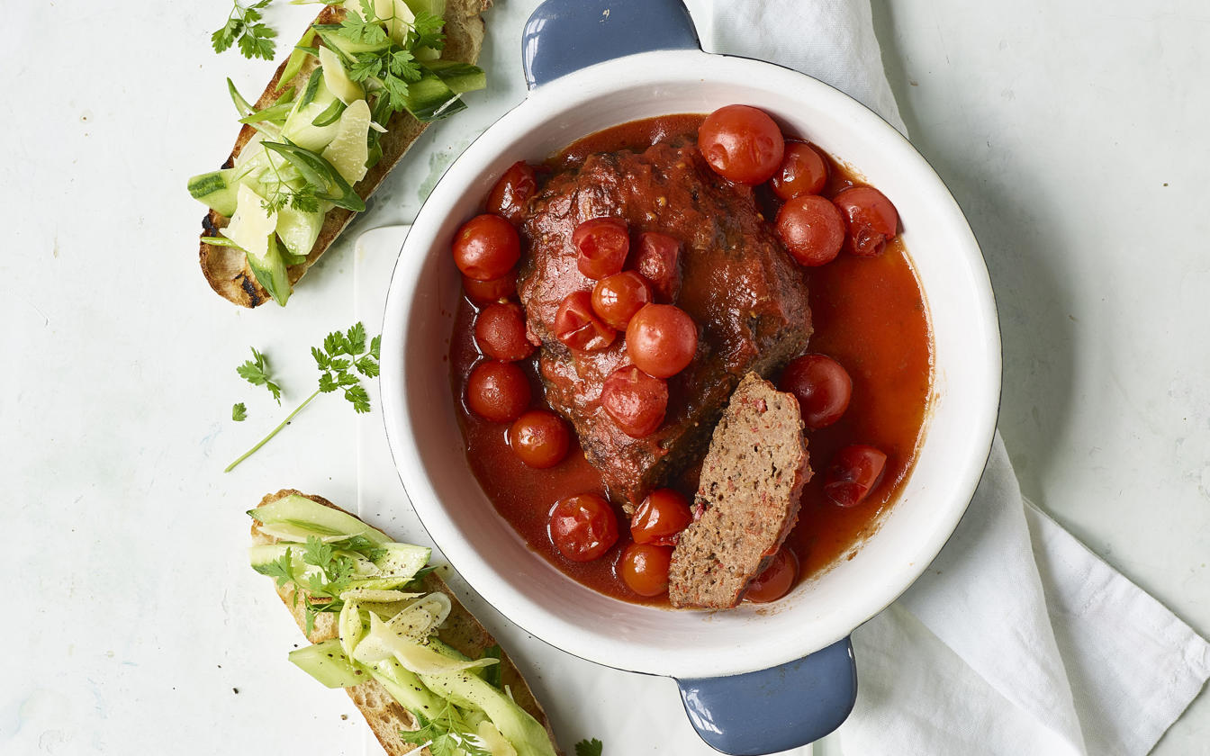 Tomatbagt farsbrød med marineret agurkesalat er en smagfuld og klassisk ret, hvor saftigt oksekødsfars kombineres med en intens tomatsauce og frisk, sprød agurkesalat. Denne ret er perfekt til både hverdag og weekend, hvor traditionel komfortmad møder en frisk, syrlig kant.
