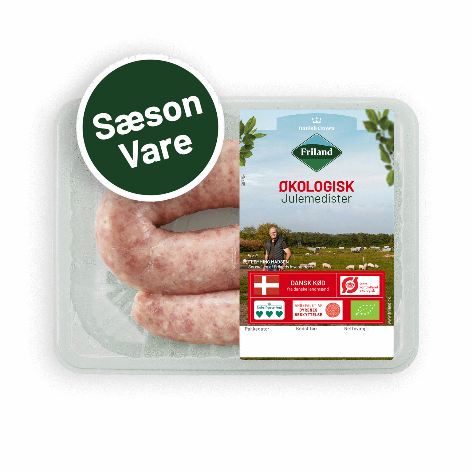 400 gØkologisk julemedister fra Friland er produceret af grovhakket kød fra danske økologiske grise. I julemedisteren er der tilsat lidt ekstra krydderier, hvilket bidrager til en velsmagende medisterpølse med en grov kødstruktur, der bibeholder saft og kraft ved tilberedning. Produktet findes i flere vægte.