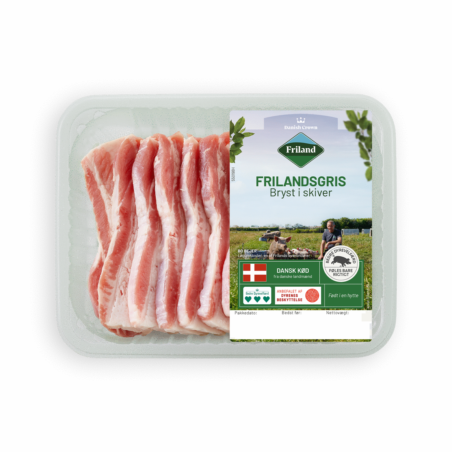 350 gBryst i skiver fra Frilandsgris er skåret af brystflæsk (brystsiden). Grisekød fra Frilandsgris kommer fra danske gårde med stort engagement for dyrevelfærd. Produktet er Anbefalet af Dyrenes Beskyttelse og har 3-hjerter i det statslige dyrevelfærdsmærke Bedre Dyrevelfærd.