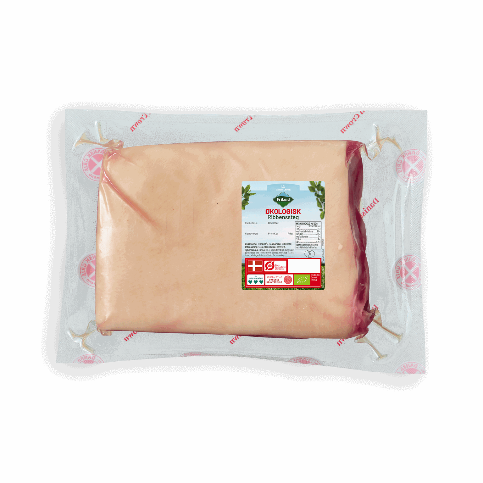 800 gØkologisk ribbenssteg fra Friland ØKOLOGI er velskåret af udvalgte råvarer. Ribbensstegen er med ridset svær og uden ben. Skåret af økologisk bryst fra gris. Produktet findes i flere vægte.