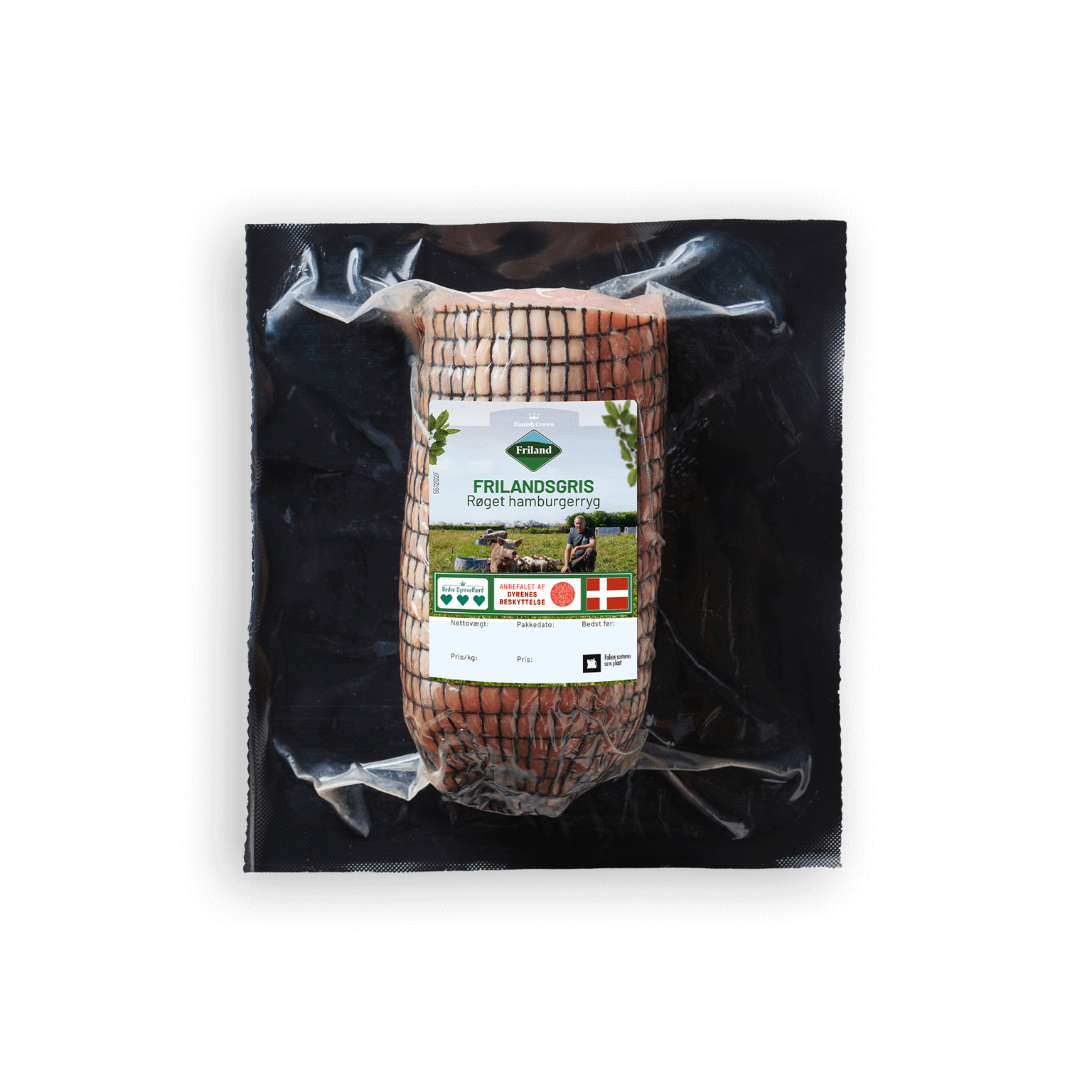 750 gHåndsorteret kamfilet af dansk Frilandsgris. Røget på krog over bøgeflis. Produktet er tildelt 3 hjerter og er anbefalet af Dyrenes Beskyttelse.