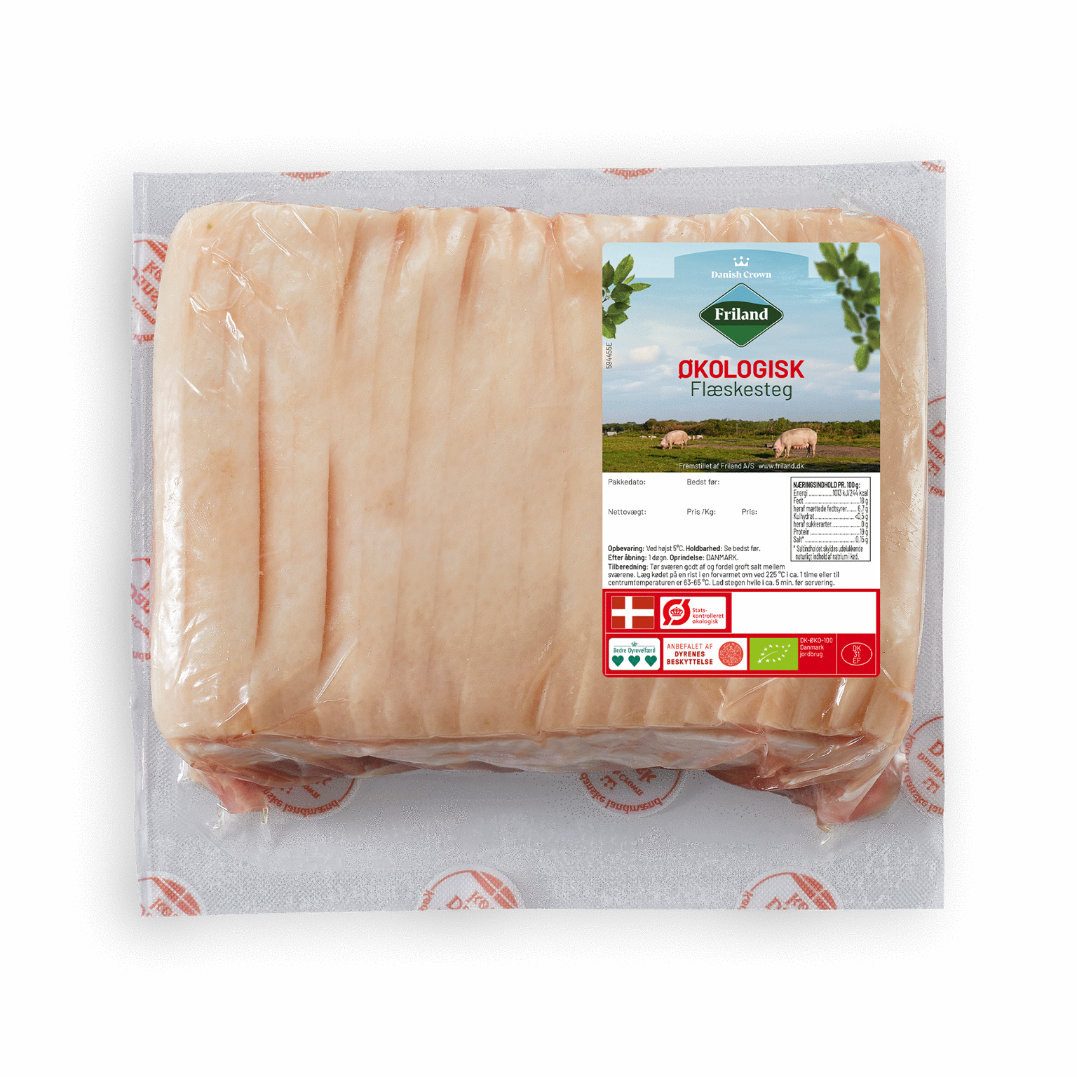 1200 gØkologisk flæskesteg fra Friland er velskåret af udvalgte råvarer. Produktet findes i flere vægte.