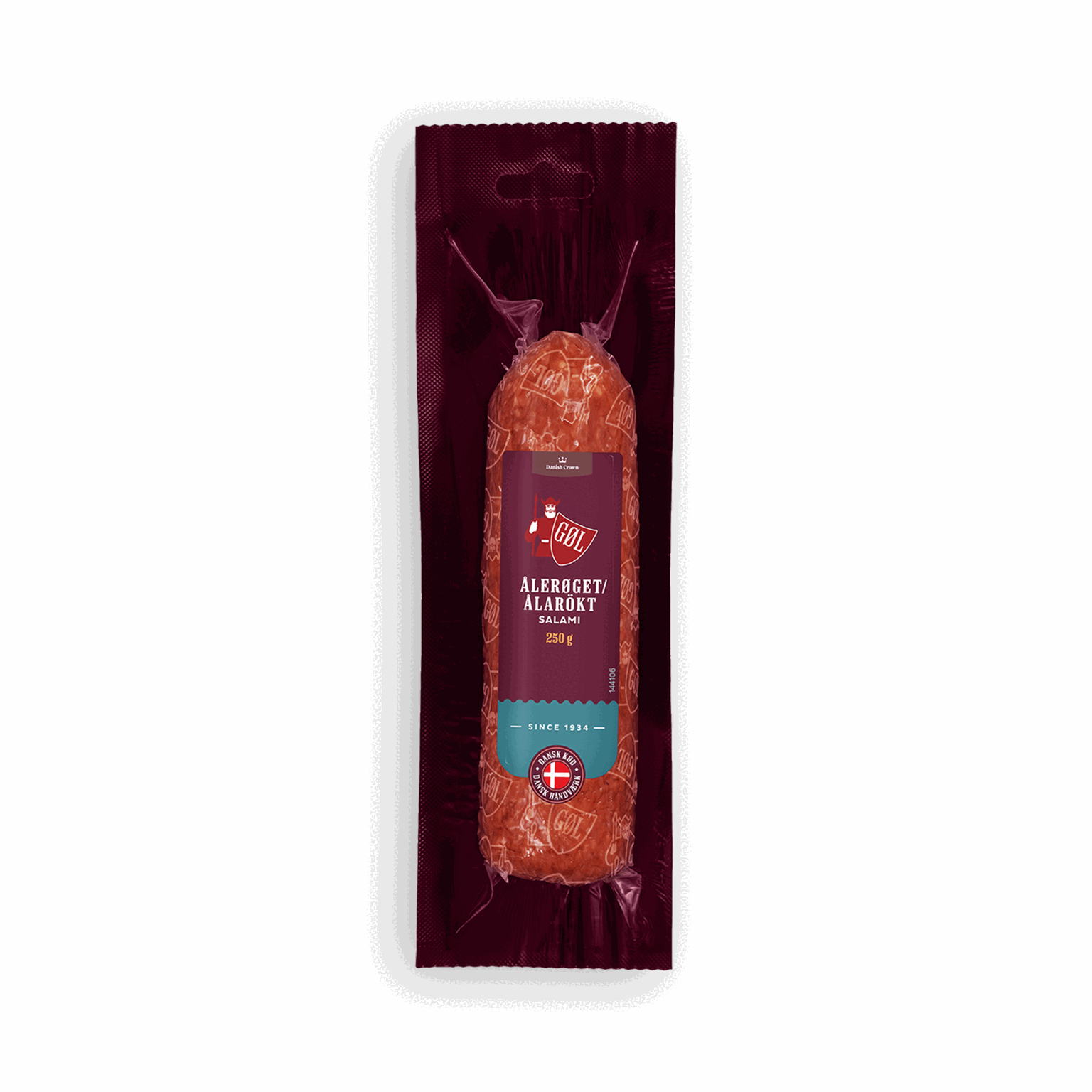 250 gGØL Ålerøget Salami er en dejlig smagsoplevelse med sin specielle varmrøgning, hvor temperaturen holdes på 65 grader. Krydderierne er afstemt til det milde men bestemt karaktergivende, og er man til den røgede smag, så kan denne variant meget vel blive en favorit. GØL Ålerøget Salami er skærefast, har et rigtigt godt bid og passer til en hver lejlighed, f.eks. frokosten, madpakken, tapas eller den kolde aftensmad. GØL Salami er fremstillet i Danmark af dansk kød og kvaliteten giver sig til kende i de traditionsrige opskrifter og det stolte håndværk udviklet igennem årtier.