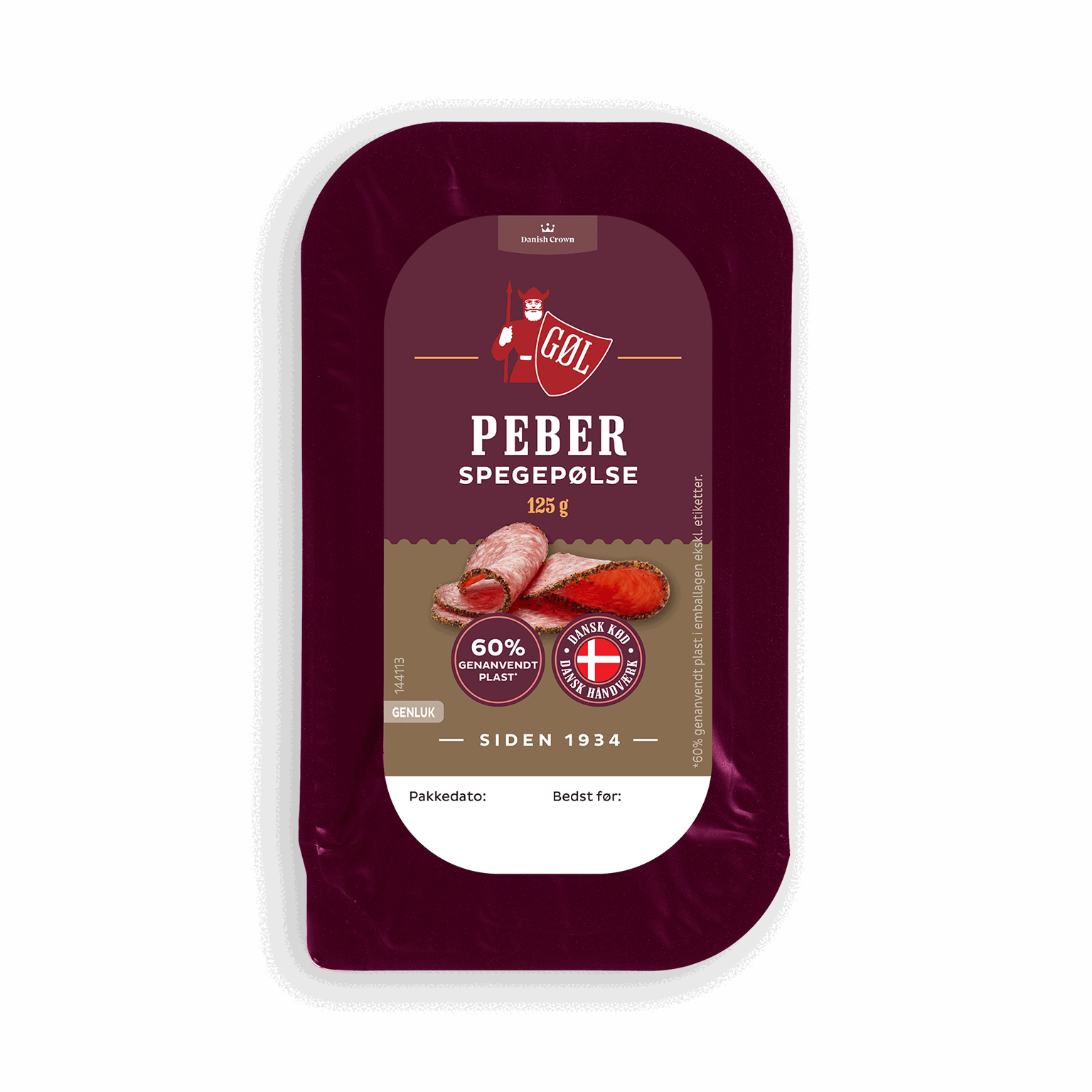 125 gGØL peberspegepølse er efter gamle nordjyske traditioner rullet i kværnede peberkorn, der giver denne klassiker en kraftig pebersmag. GØL Peberspegepølse er et must, hvis du skal dække det store bord i gode venners lag. Prøv den krydrede kvalitetsspegepølse på det brød du foretrækker til frokosten, madpakken, tapas eller den kolde aftensmad. GØL spegepølsen er fremstillet i Danmark af dansk kød og kvaliteten giver sig til kende i de traditionsrige opskrifter og det stolte håndværk udviklet igennem årtier.