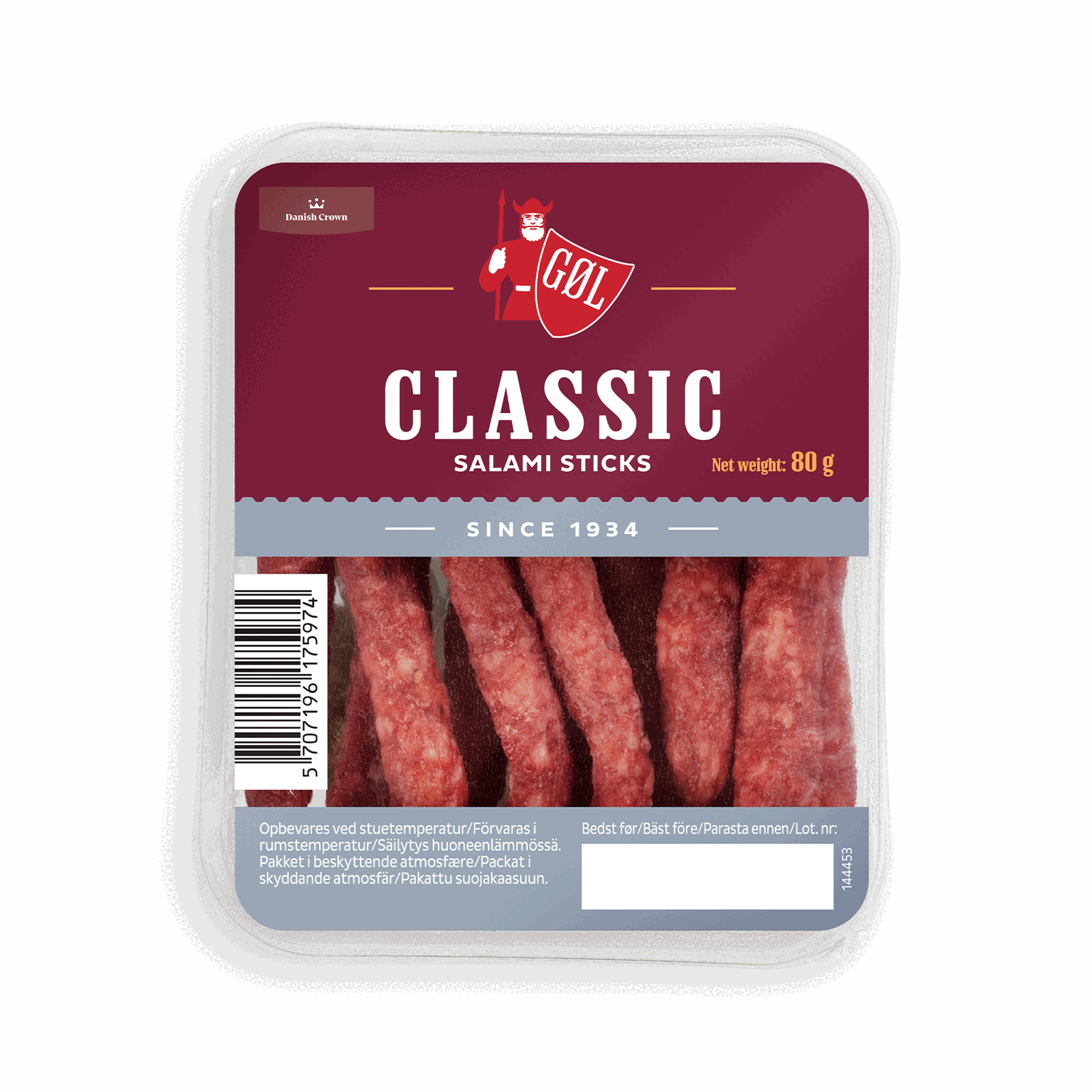 80 gGØL Classic salami stick er en vellidt klassisk snack, der er mildt krydret med hvidløg og peber. Den velafbalancerede og milde krydring er nøje udvalgt, så snacken kan nydes af hele familien. Server for eksempel denne salami stick som en nem del af en tapasmenu sammen med andre tapasretter. Den klassiske salami snack er også god som en lille appetitvækker inden middagen eller sammen med en kold øl på en varm sommerdag