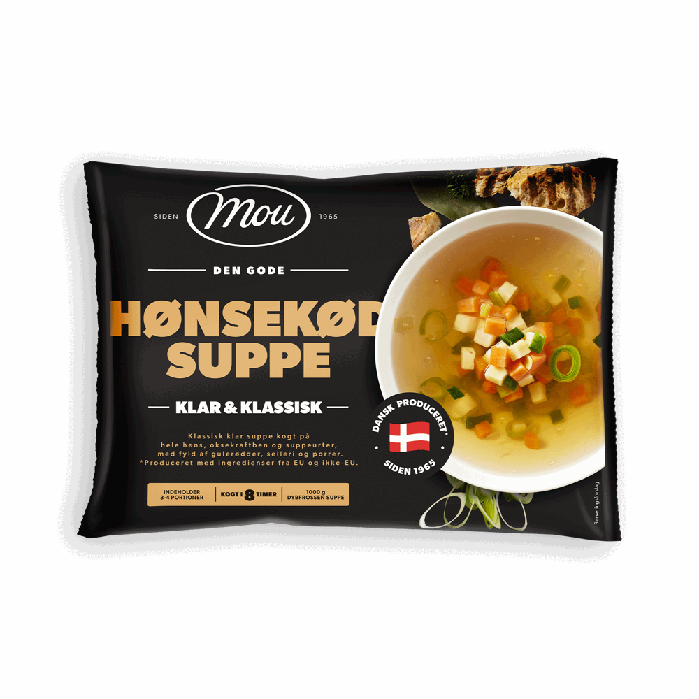 Mild og fyldig flødelegeret suppe med sprøde tern af persillerod og pastinak, smagt til med purløg (20% fyld). Kogt på hele høns, oksekraftben og suppeurter