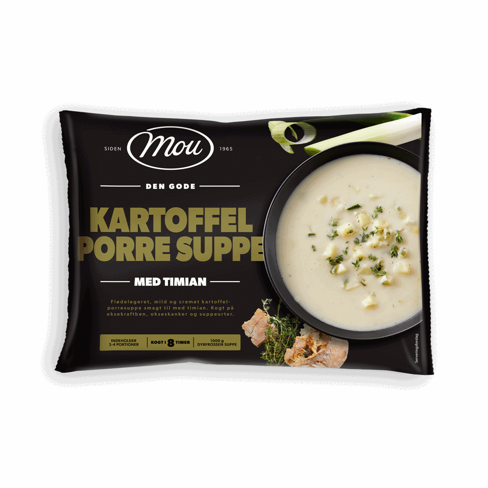 Flødelegeret, mild og cremet kartoffel-porresuppe smagt til med timian. Kogt på oksekraftben, okseskanker og suppeurter