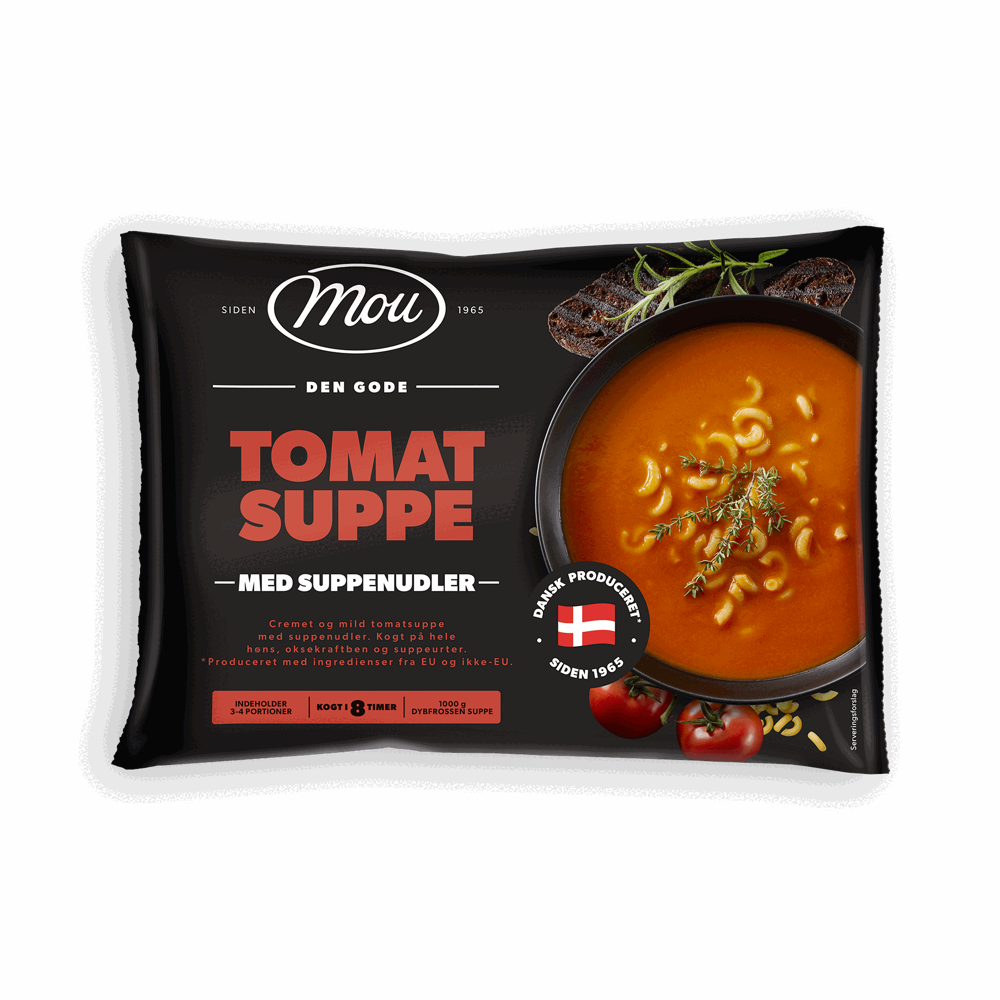 Mild, cremet og flødelegeret tomatsuppe med fyld af suppenudler. Kogt på hele høns, oksekraftben og suppeurter