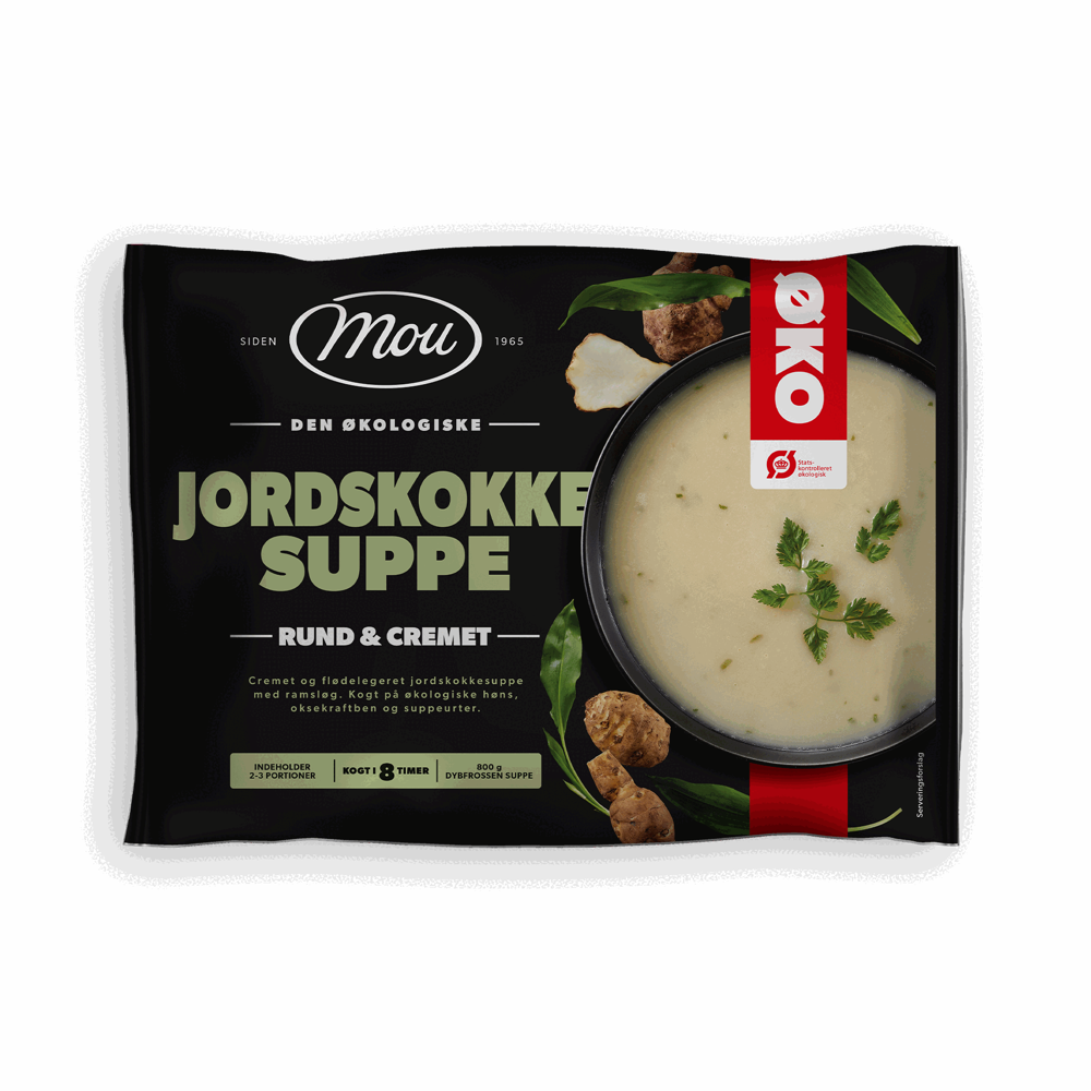 Cremet og flødelegeret jordskokkesuppe med ramsløg. Kogt på økologiske høns, oksekraftben og suppeurter.