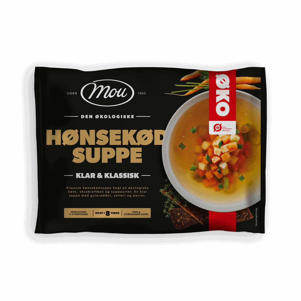 Klassisk hønsekødsuppe kogt på økologiske høns, oksekraftben og suppeurter. En klar suppe med gulerødder, selleri og porrer.