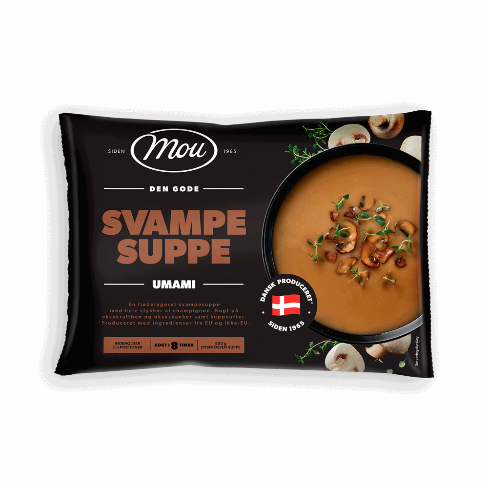En flødelegeret svampesuppe med hele stykker af champignon og karakteristisk umami-smag. Kogt på oksekraftben og okseskanker samt suppeurter