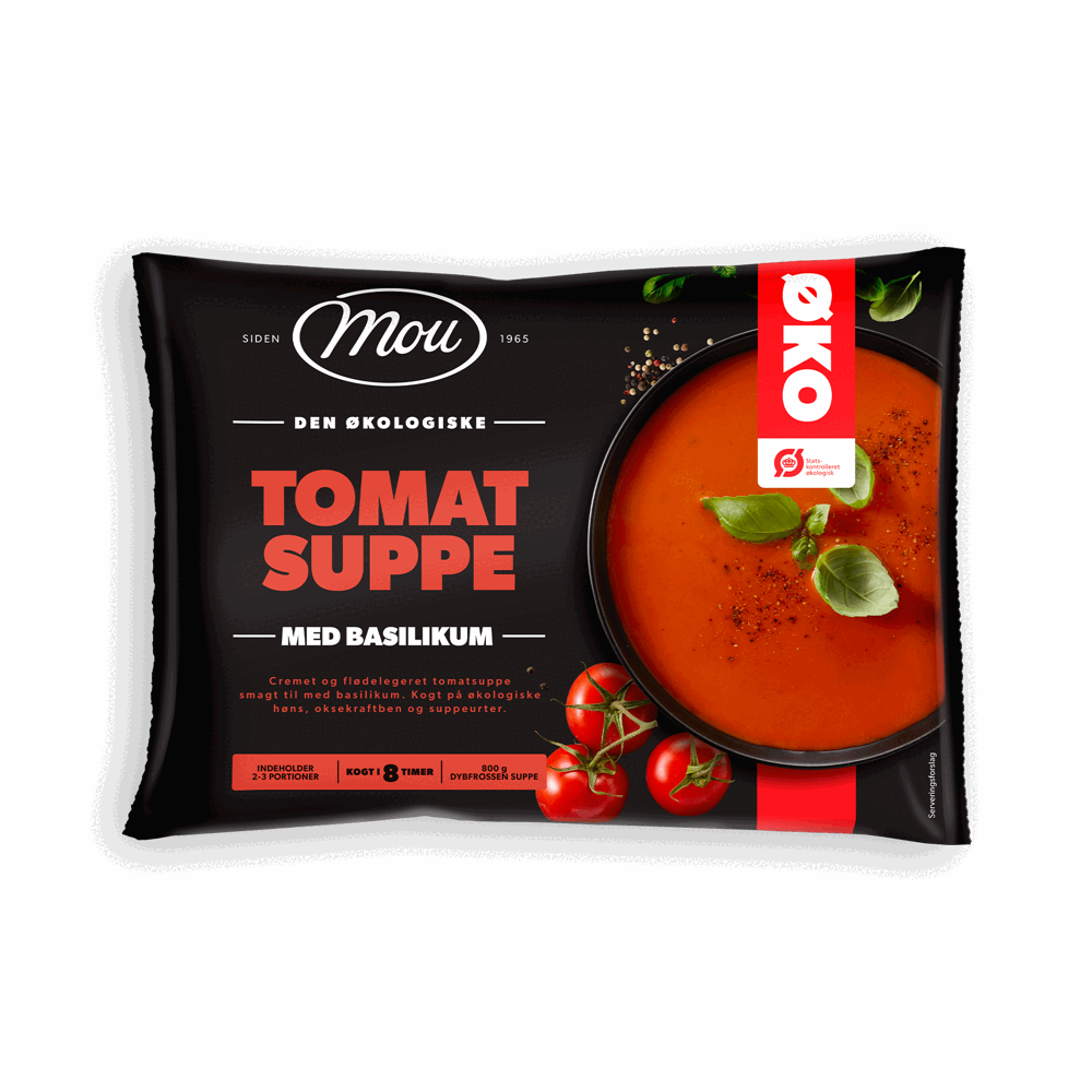 Cremet og flødelegeret tomatsuppe smagt til med basilikum. Kogt på økologiske høns, oksekraftben og suppeurter