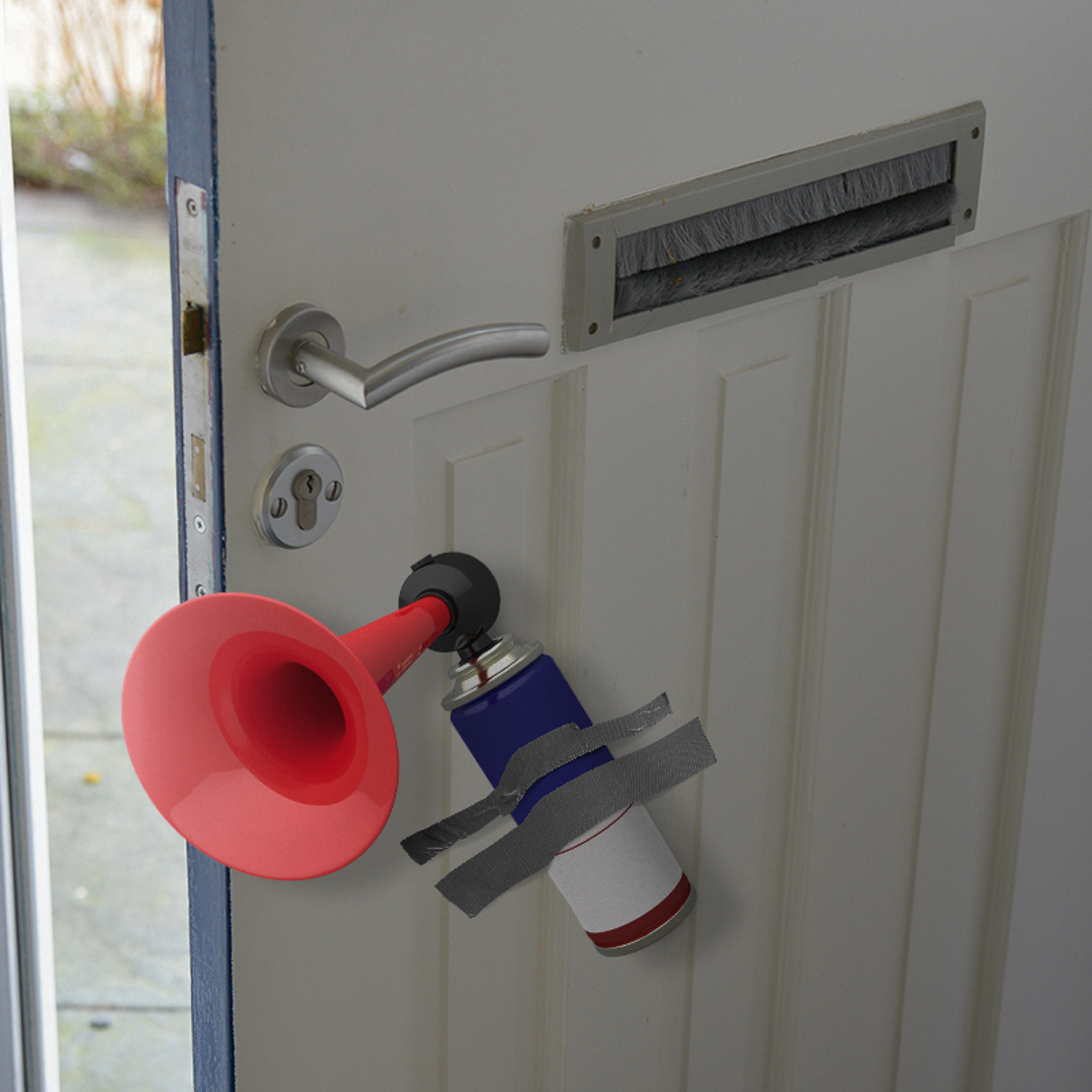 Sæt et lufthorn fast bag en dør eller under en kontorstol så den blæser, hvis man åbner døren eller sætter sig ned.
