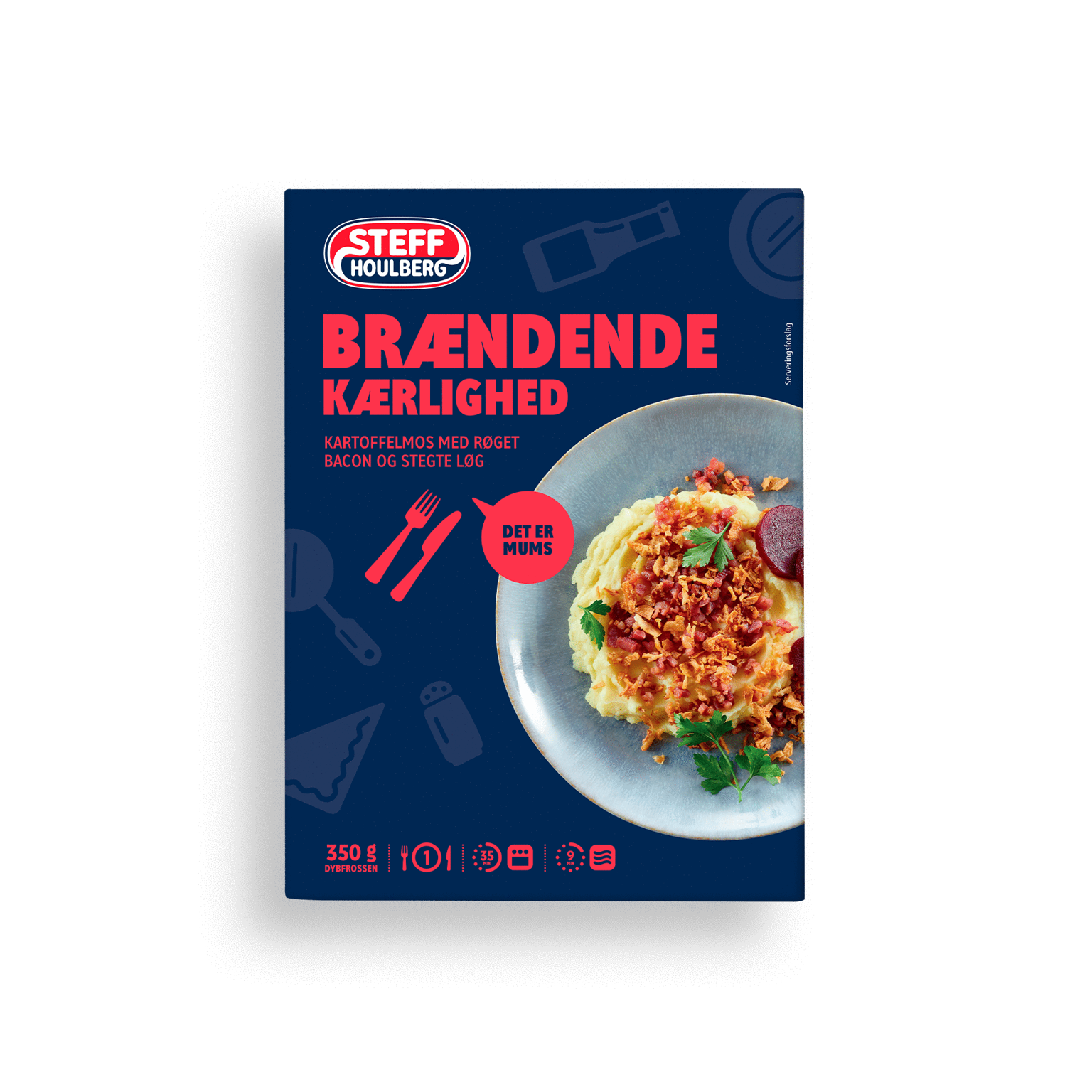 INGREDIENSER: Kartoffelmos 75%: Kartofler (68%), SØDMÆLK, SMØR, salt, krydderi og krydderiekstrakt. Bacon 14%: Grisekød, salt, antioxidant (E 301), konserveringsmiddel (E 250). Stegte løg 11%: Løg (76%) , palmeolie, HVEDEMEL, salt.