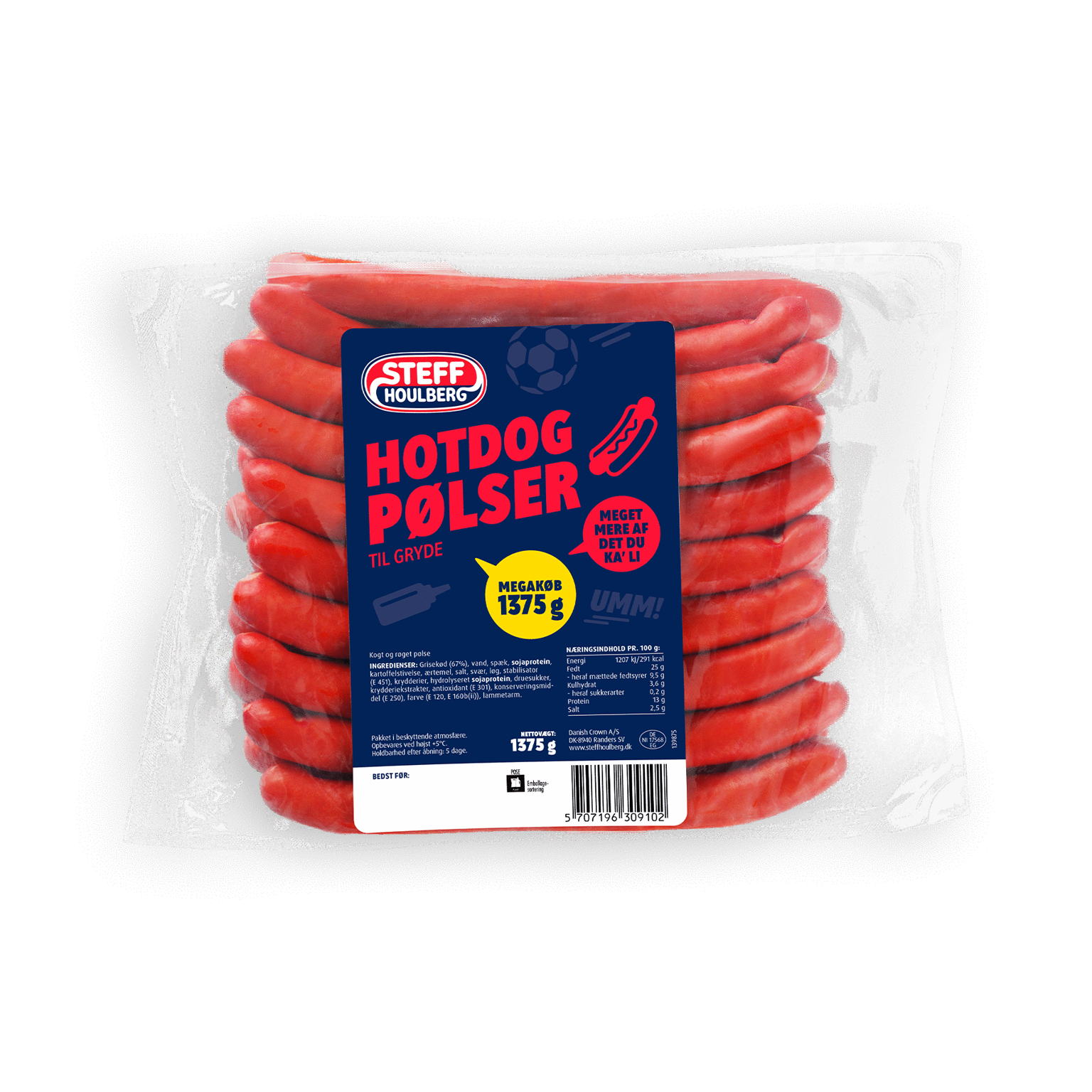 Ingredienser: Grisekød (67%), vand, spæk, SOJAPROTEIN, kartoffelstivelse, ærtemel, salt, svær, løg, stabilisator (E 451), krydderier, hydrolyseret SOJAPROTEIN, druesukker, krydderiekstrakter, antioxidant (E 301), konserveringsmiddel (E 250), farve (E 120, E 160b(ii)), lammetarm.