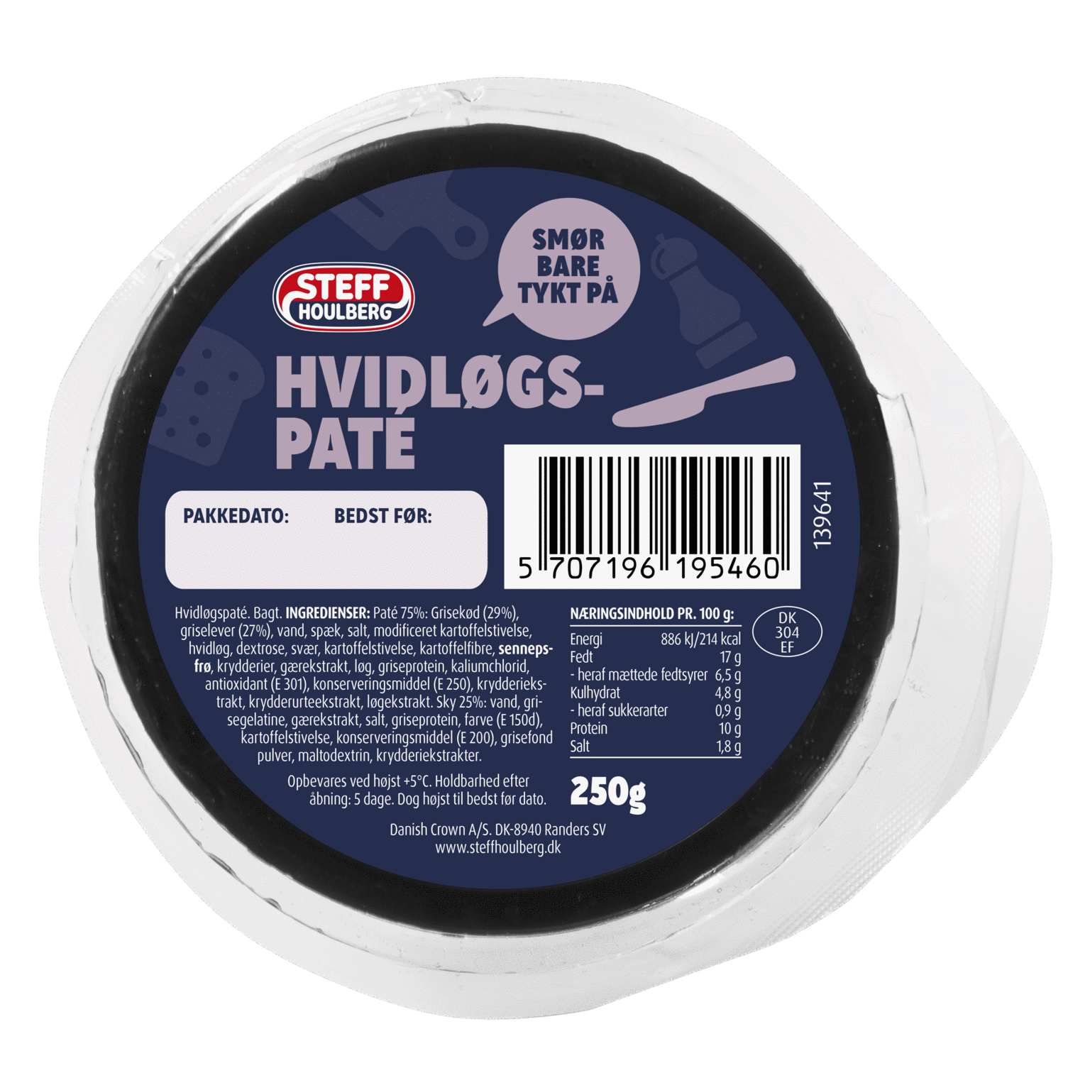Ingredienser: Paté 75%: Grisekød (29%), griselever (27%), vand, spæk, salt, modificeret kartoffelstivelse, hvidløg, dextrose, svær, kartoffelstivelse, kartoffelfibre, SENNEPSFRØ, krydderier, gærekstrakt, løg, griseprotein, kaliumchlorid, antioxidant (E301), konserveringsmiddel (E250), krydderiekstrakt, krydderurteekstrakt, løgekstrakt. Sky 25%: vand, grisegelatine, gærekstrakt, salt, griseprotein, farve (E150d), kartoffelstivelse, konserveringsmiddel (E200), grisefond pulver, maltodextrin, krydderiekstrakter.