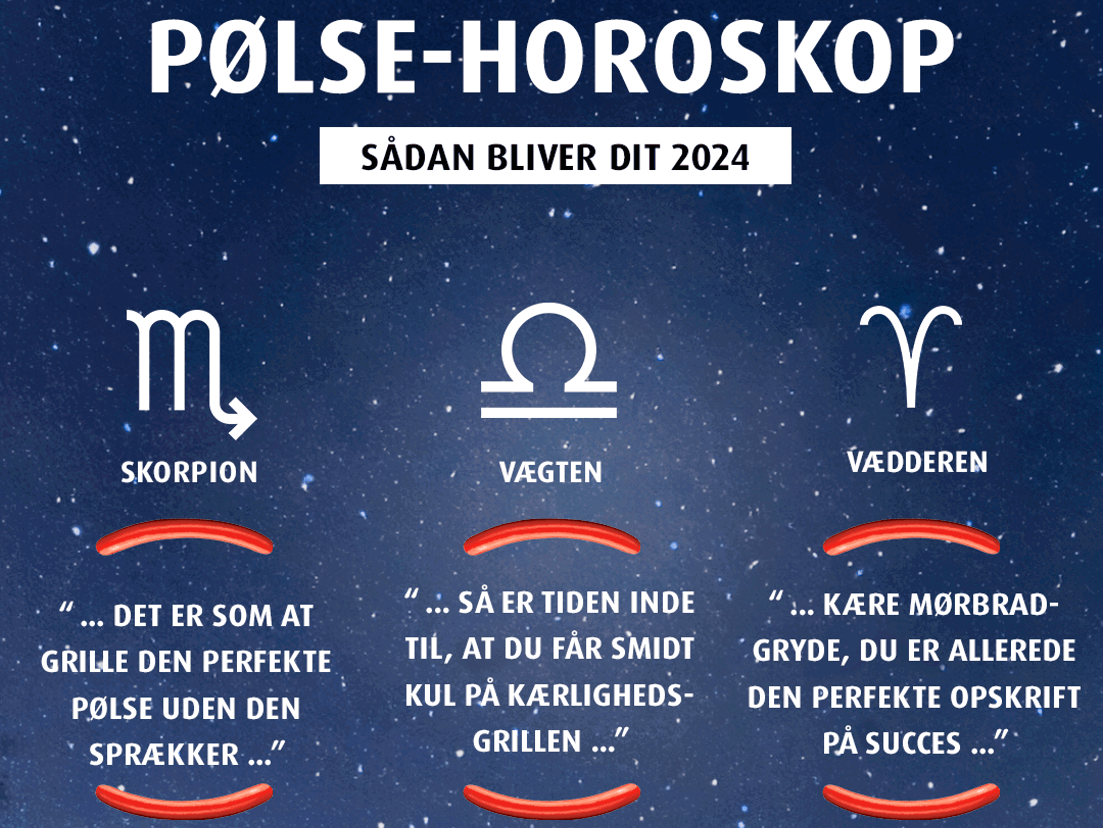 Er du klar til at folde dig ud i at se hvor lang din pølse kan blive? Eller blive stegt i en af vores grillende quizzer? Test fx om du kan snakke pølsevognsslang som en rigtig ekspert? Om du er svigermors yndlings-snack? Eller find ud af, hvilken pølse der matcher din personlighed bedst.