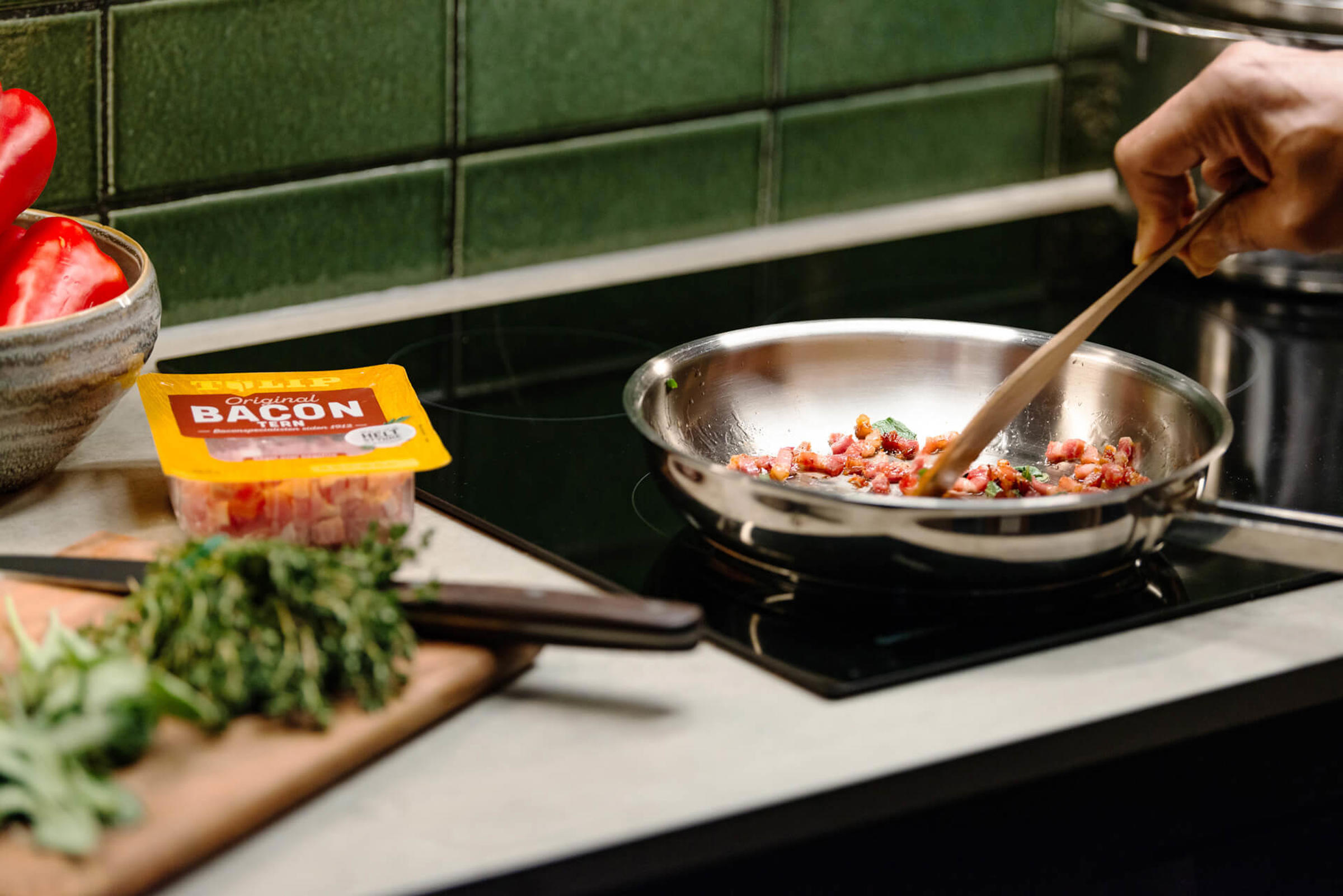 Bacons anvendelsesmuligheder er uendelige – og det samme gælder med tilberedning. Du kan lave bacon i ovn, bacon på panden, og bacon i mikroovnen. Besøg vores inspirationsside, hvor du kan blive klogere på, hvordan du steger bacon.