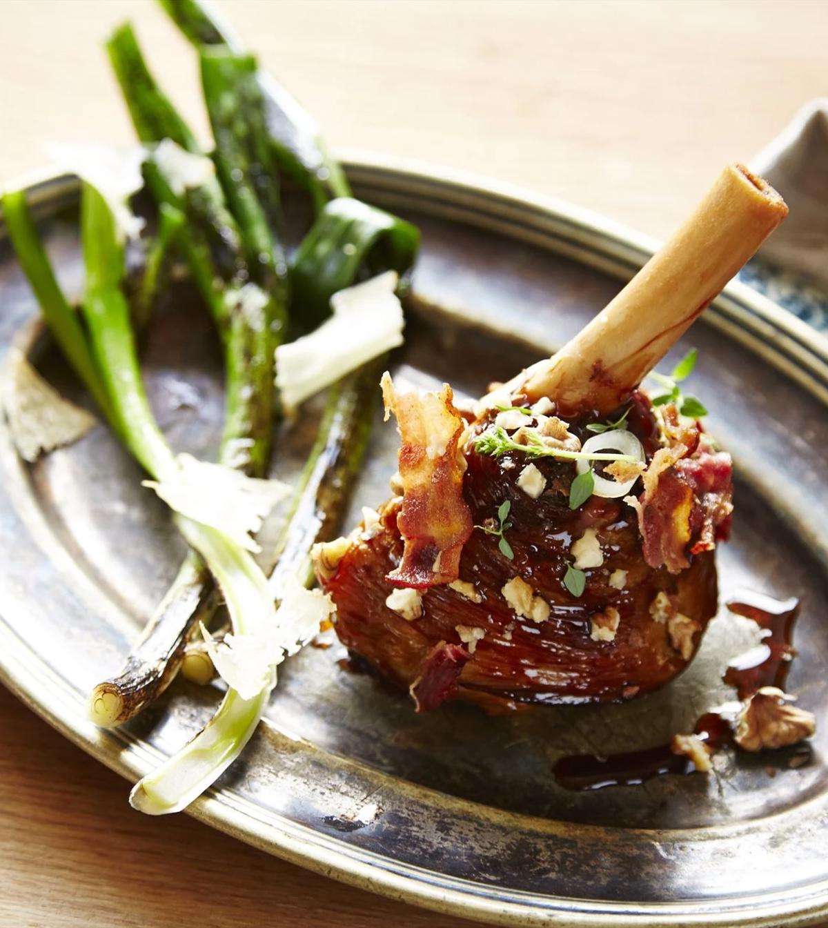 Smagssymfoni opstår, når råvarer kombineres, og de hver især fremhæver hinanden. Aspargsene, osten og valnødderne overhældes med den varme bacon-vinaigrette - og duften stiger op.