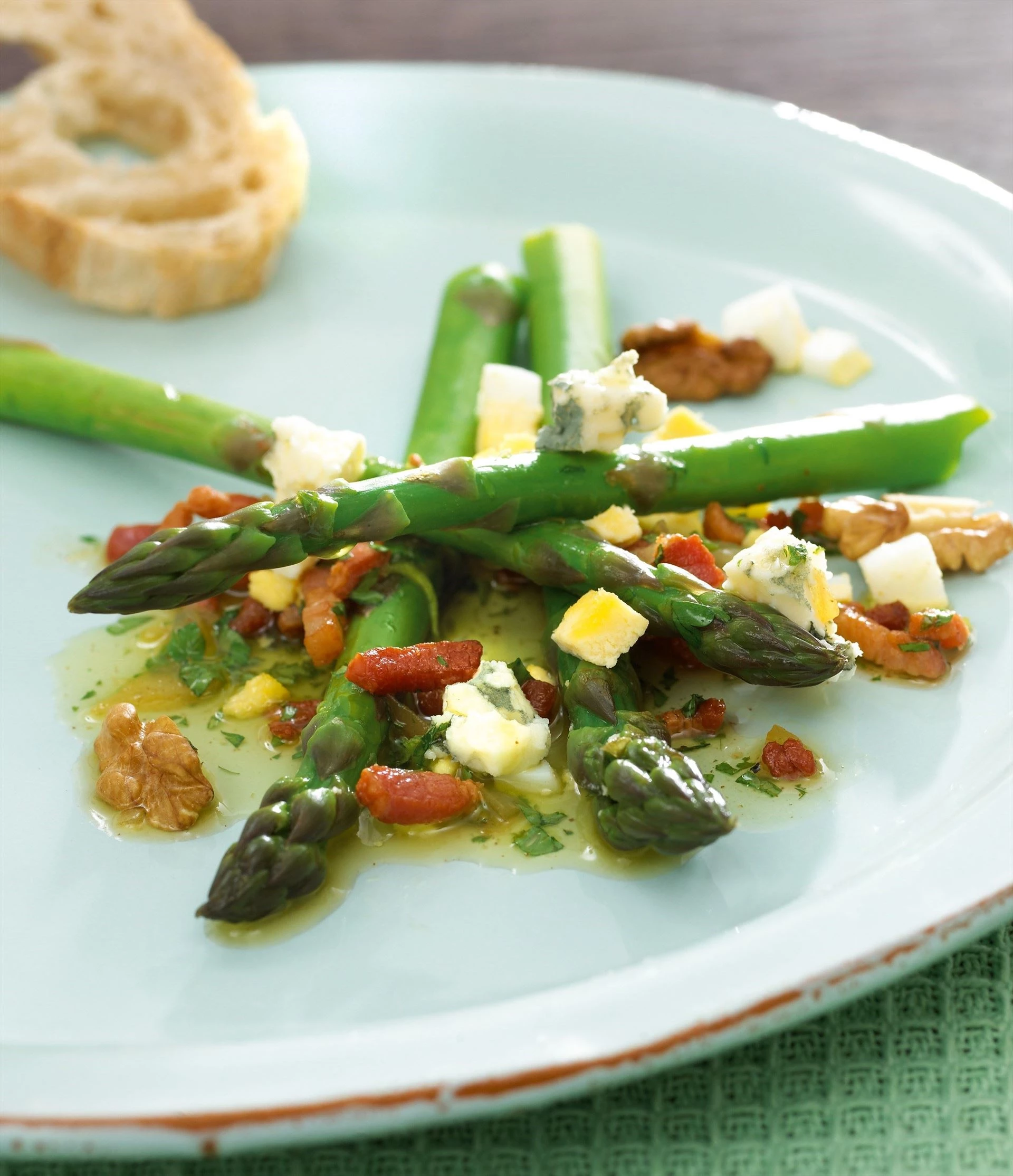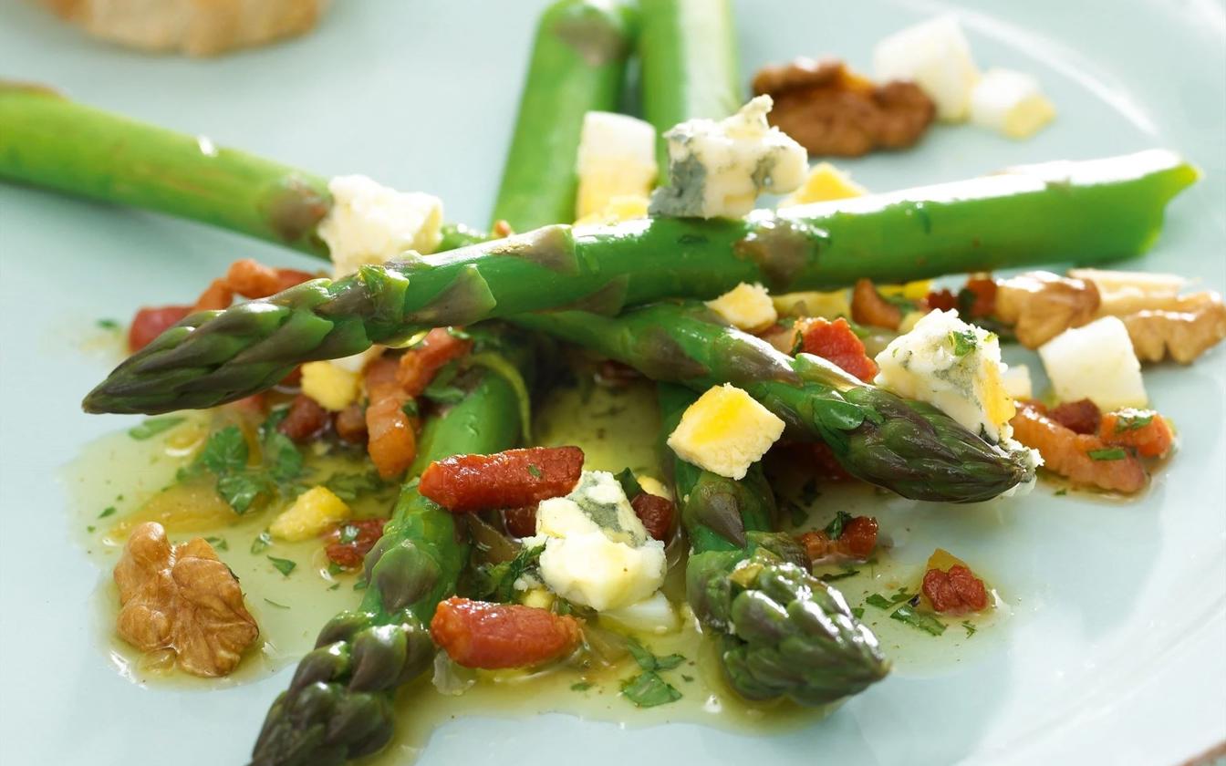 Asparges tilsat vinaigrette med bacon, ost og valnødder
