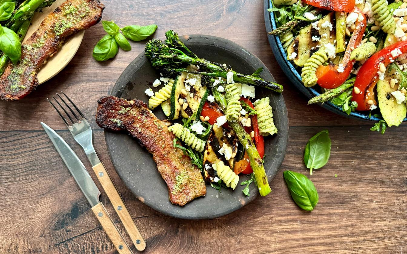 Bacon Steaks med grillet pastasalat er en farverig, frisk og fyldig ret, der kombinerer saftige og sprøde Tulip Bacon Steaks med en varm pastasalat fyldt med grønt og hjemmelavet pesto. De grillede grøntsager giver retten en ekstra dybde og let sødme, mens feta og pinjekerner tilfører cremethed og knas. En perfekt ret til både grill-aftener, hverdagsforkælelse og lette sommermåltider.