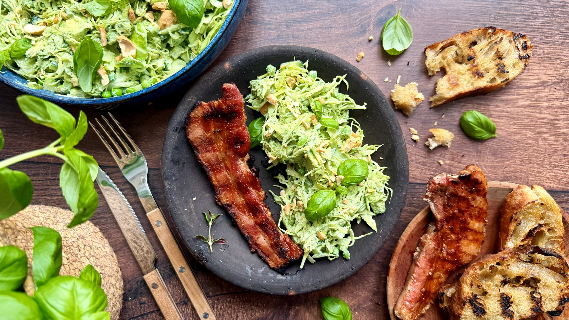 De saftige bacon steaks får en dejlig sprød og karamelliseret overflade på grillen, mens kartoffelsalaten giver modspil med både syre, friskhed og urter