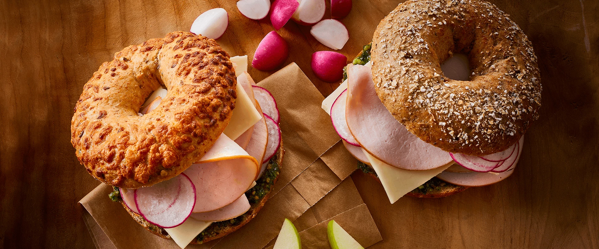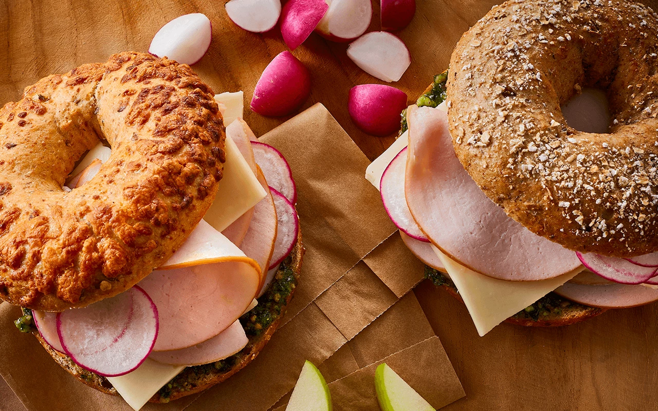 Bagel er et blødt og tæt stykke brød med en sej krumme. Derfor mætter det bedre end en almindelig skive brød. Kalkunen går godt i spænd med den milde ost, mens den friske persillepesto og de sprøde radiser giver bagelsandwichen et ekstra pift.