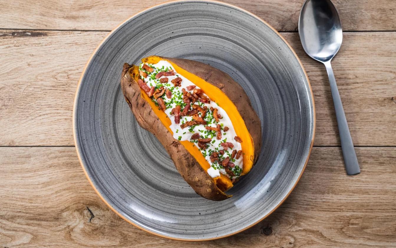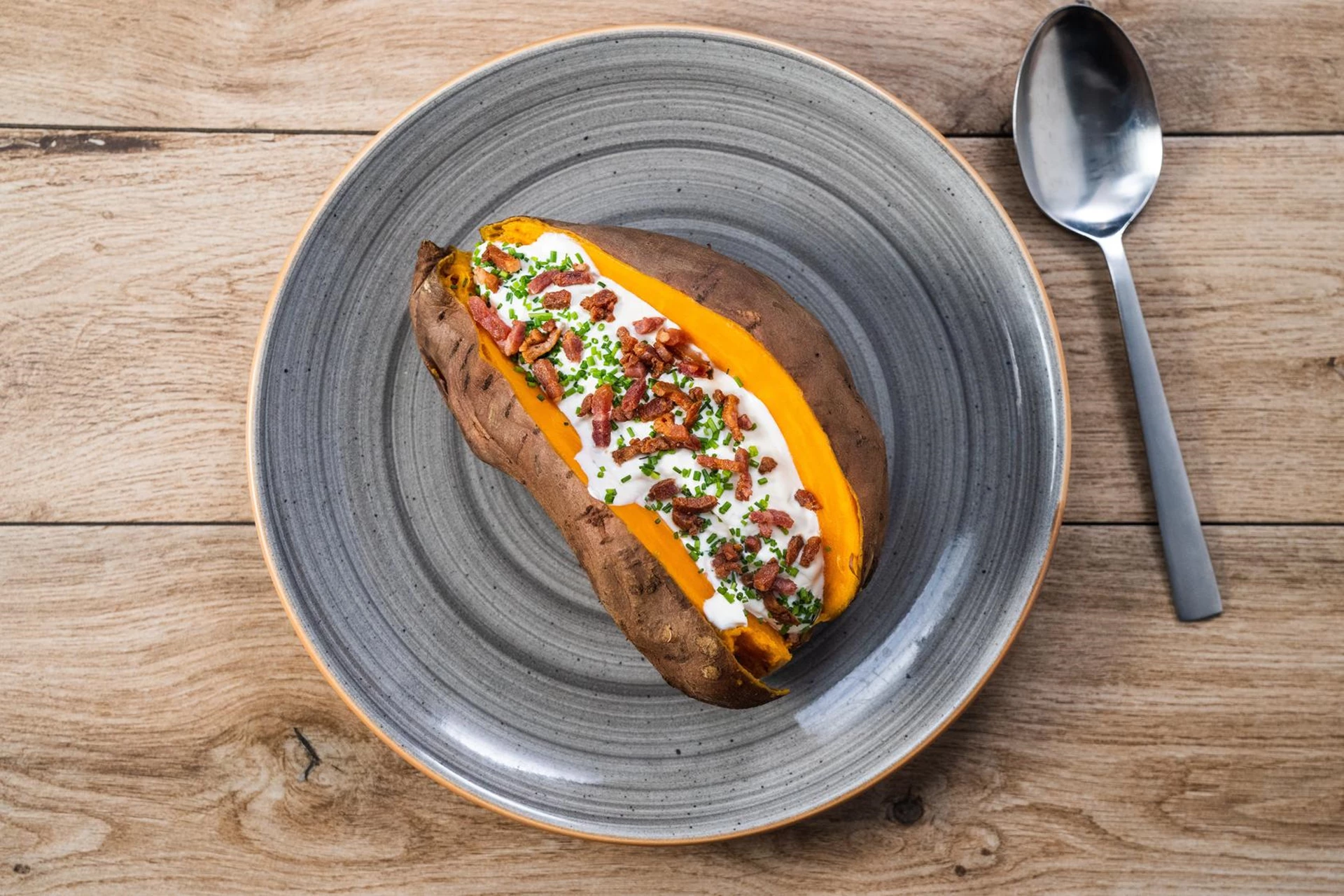 Ovnbagte søde kartofler er både nemme og lækre – og de smager fantastisk med creme fraiche, sprød bacon og frisk purløg. En skøn kombination af sødme og salt, der gør sig godt som tilbehør til aftensmaden eller som et let måltid i sig selv.