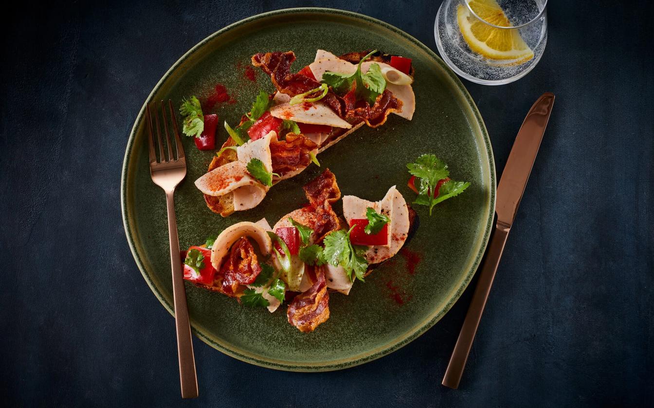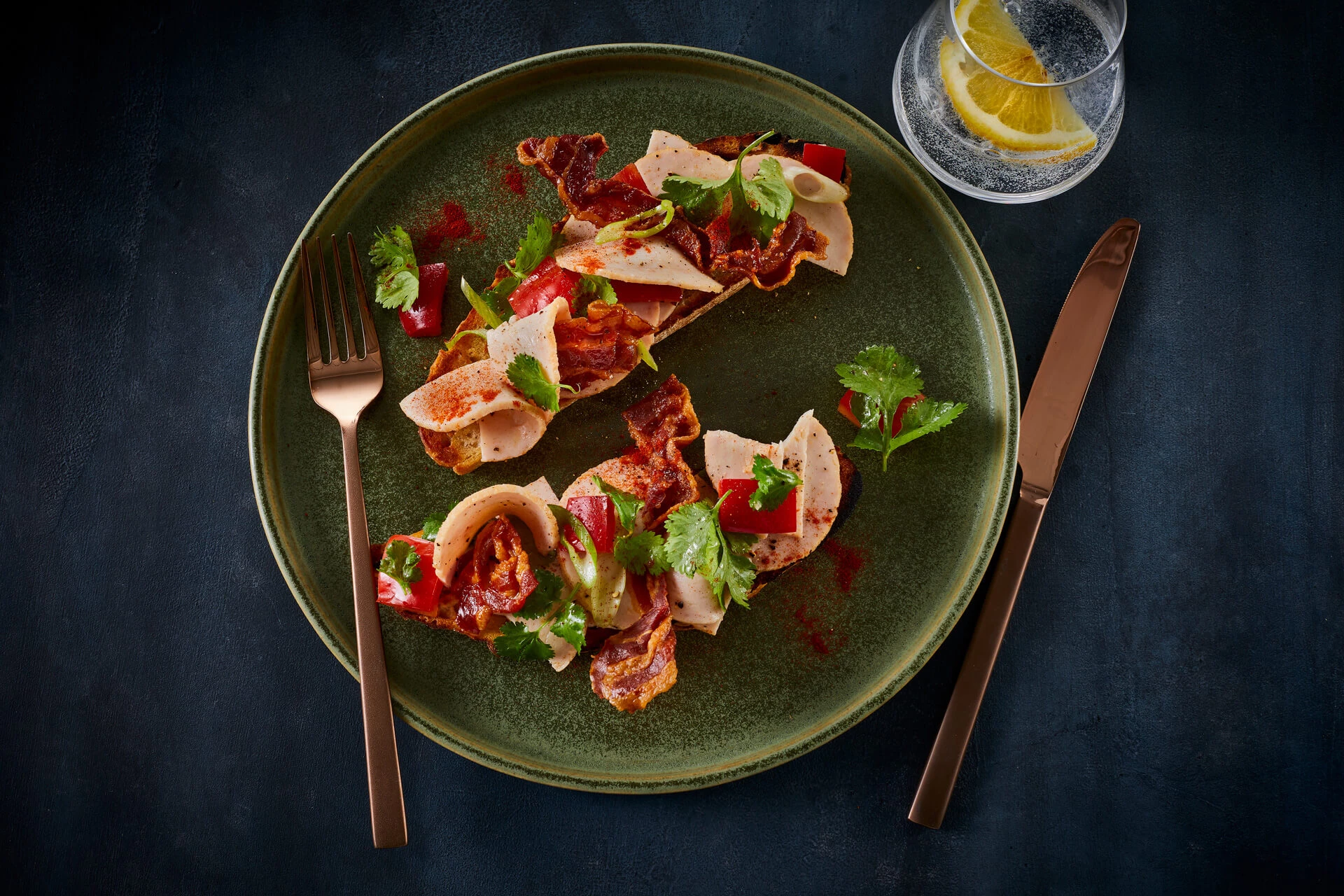 Bruschetta er en klassisk italiensk appetizer, men retten gør sig også godt som en let frokost, eller når du vil gøre lidt ekstra ud af madpakken. I denne opskrift har vi skiftet nogle af de klassiske elementer som tomat og ost ud med peberfrugt og forårsløg. Derudover topper vi bruschettaen med en spicy kyllingesalat og sprød bacon, som giver maden et lækkert knasende bid. Prøv selv den nemme ret enten serveret som forret, som en del af større måltid eller som en luksuriøs frokost.